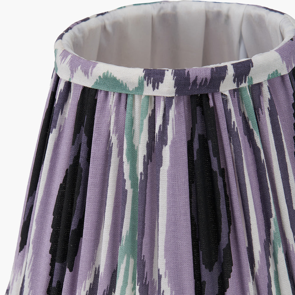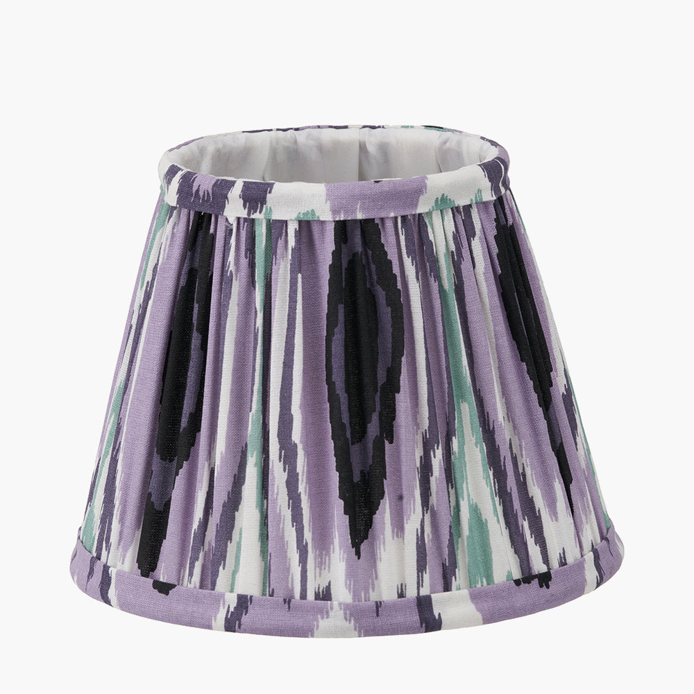 The Izara 16cm cotton gathered, tapered shade is adorned with a stunning Ikat pattern in shades of purple and lilac. The show-stopping shade will look great on a multitude of bases.