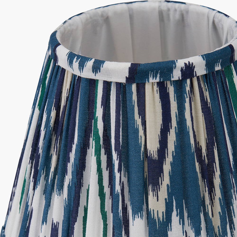 The Izara 16cm cotton gathered, tapered shade is adorned with a stunning Ikat pattern in a colour palette of blues and naturals. The show-stopping shade will look great on a multitude of bases.