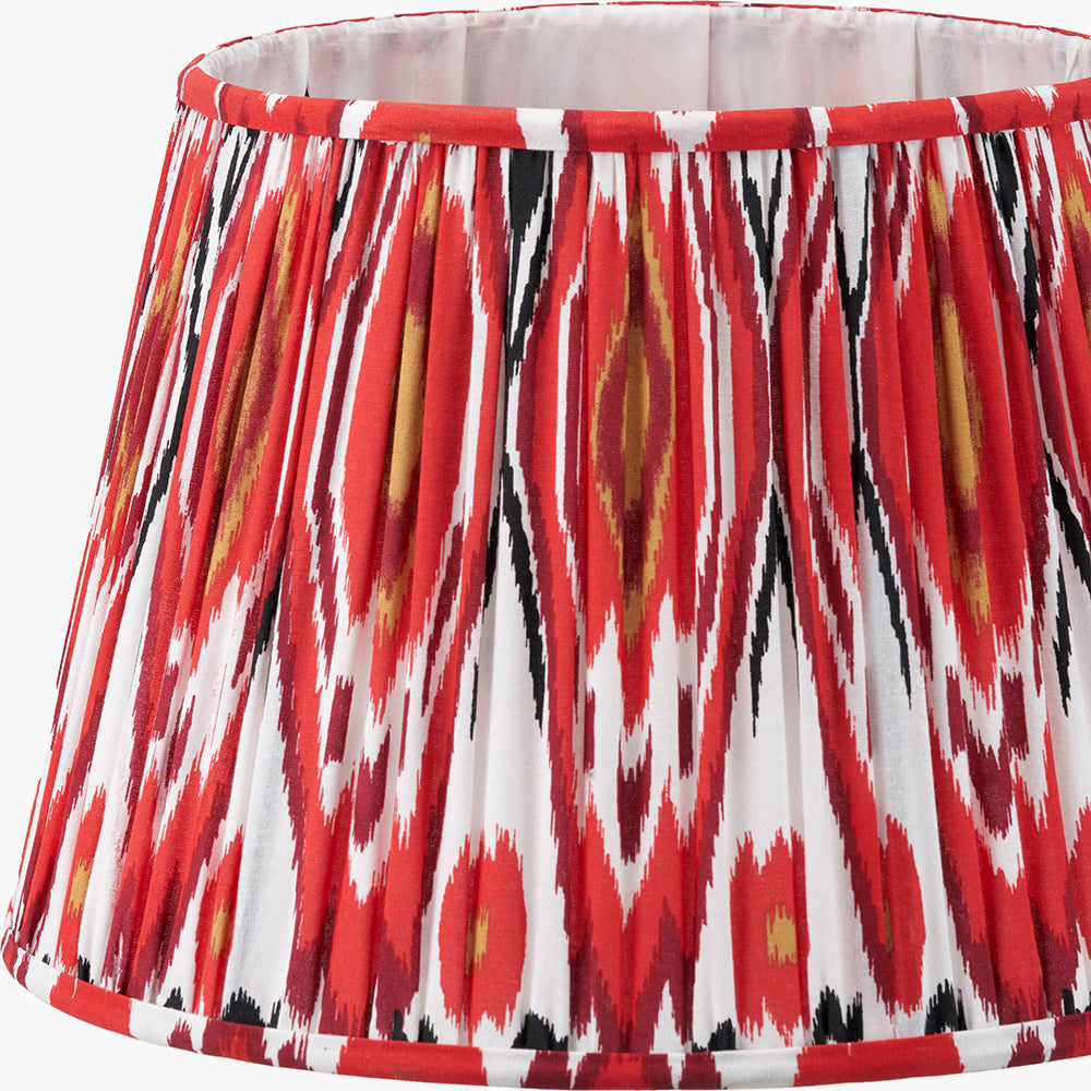 The Izara 35cm cotton gathered, tapered shade is adorned with a stunning Ikat pattern in a colour palette of reds. The show-stopping shade will look great on a multitude of bases.