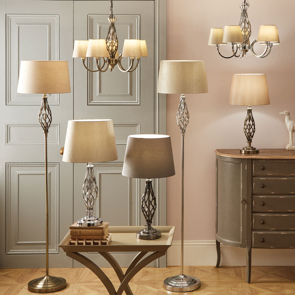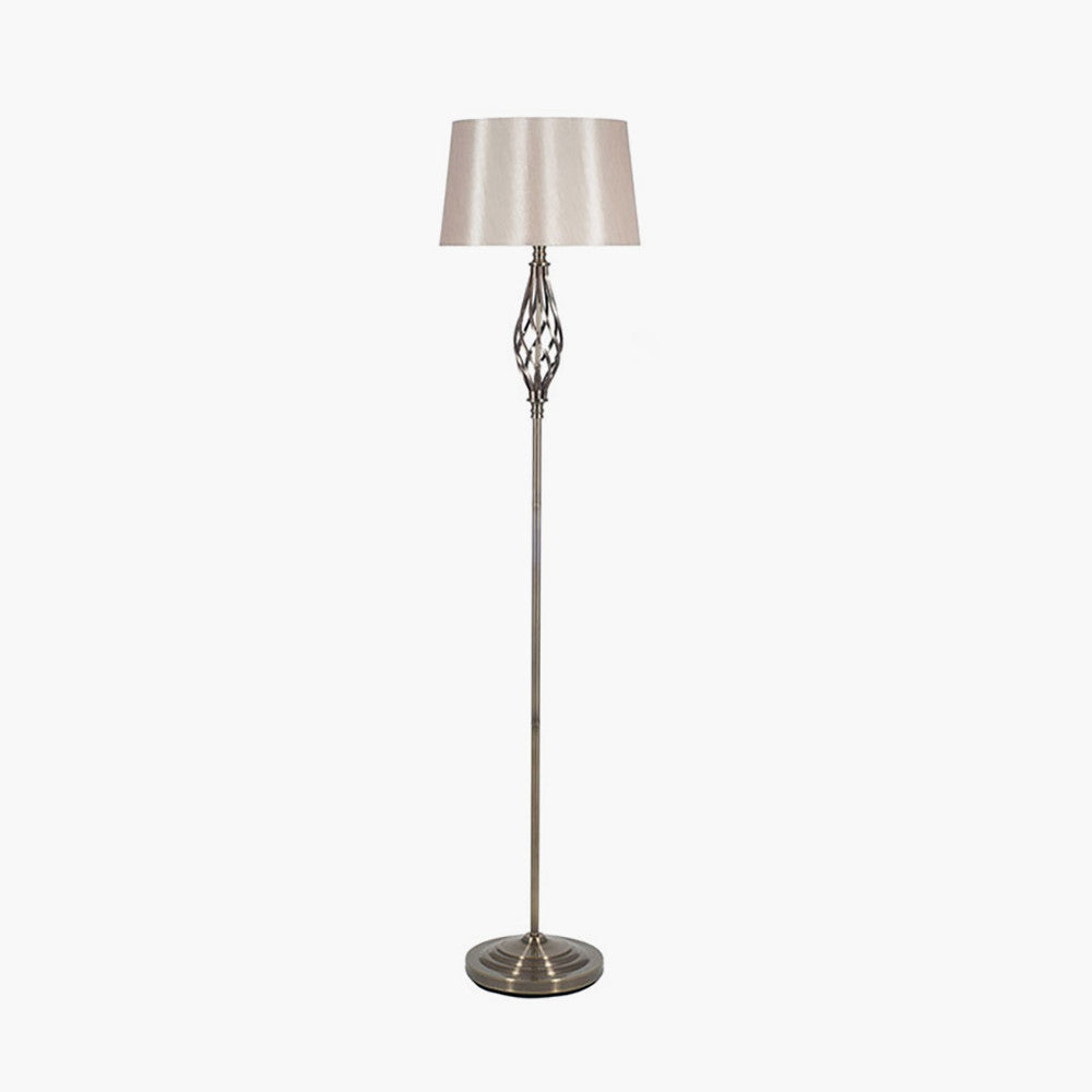This stunning antique brass metal floor lamp base has a unique twist design and comes complete with metallic champagne coloured polysilk tapered shade. Beautifully proportioned, this lamp will be a lovely addition to any room. Also available; a matching table lamp.