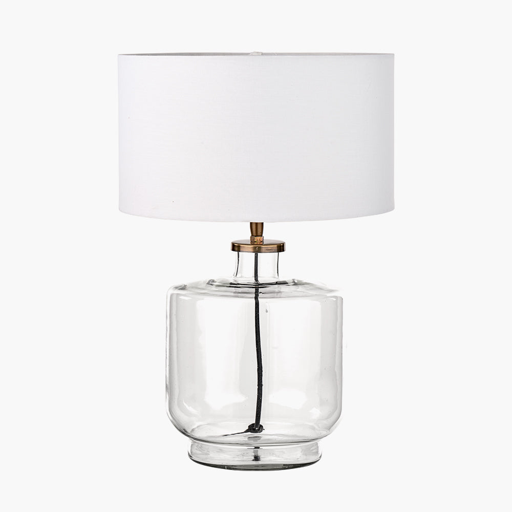 Elevate Your Space with the Josie Clear Glass and Antique Brass Metal Table Lamp Base with Harry 30cm Ivory Cotton Mix Cylinder Lampshade
