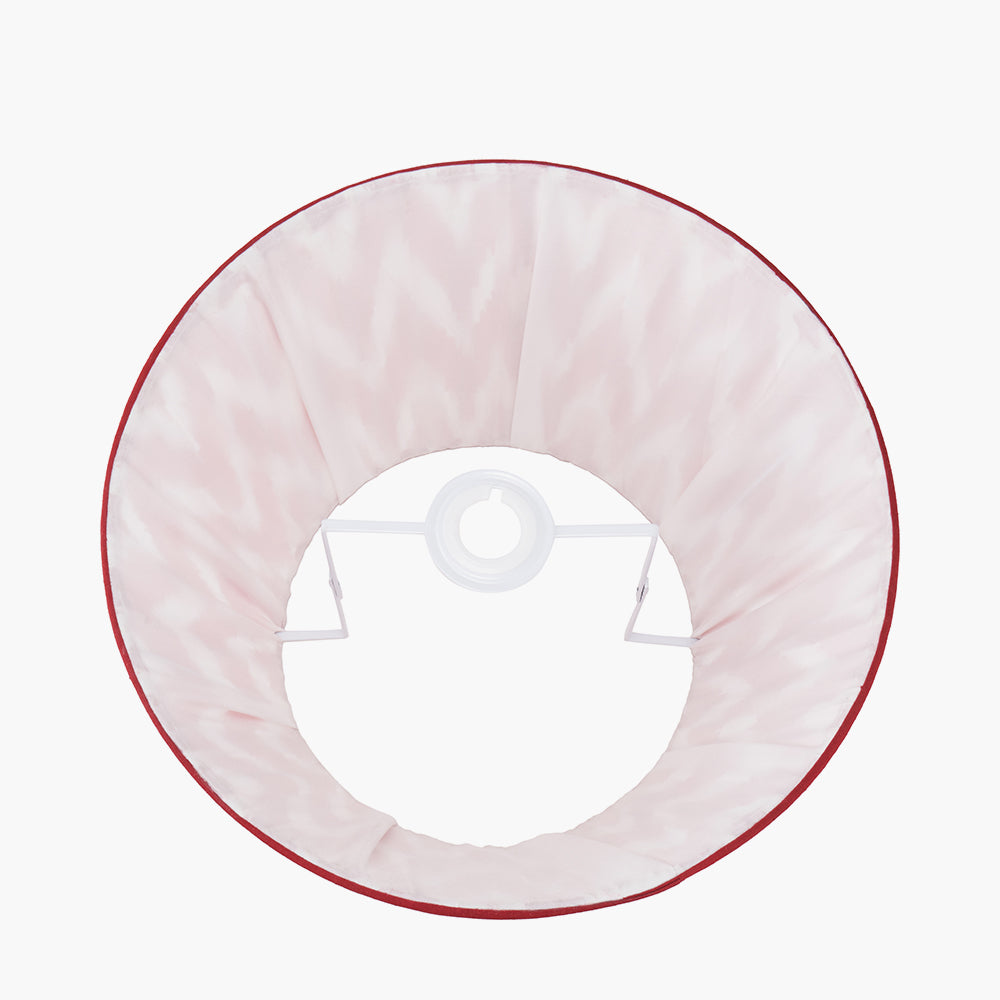 The Kamilah 30cm cotton mushroom pleat, tapered lampshade showcases a vibrant red and white chevron pattern, with a deeper red binding, adding a fresh and contemporary touch to any room. This eye catching design pairs effortlessly with a variety of lamp bases. This lampshade features a reversible gimbal, allowing it to be used with either a table or floor lamp base, or reversed for use as a ceiling pendant.