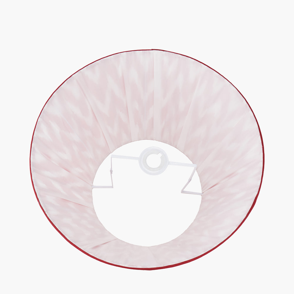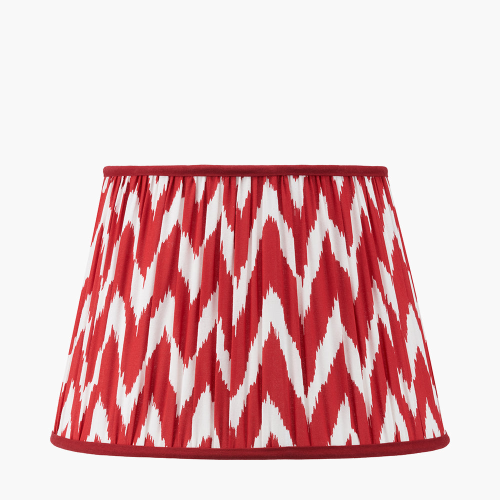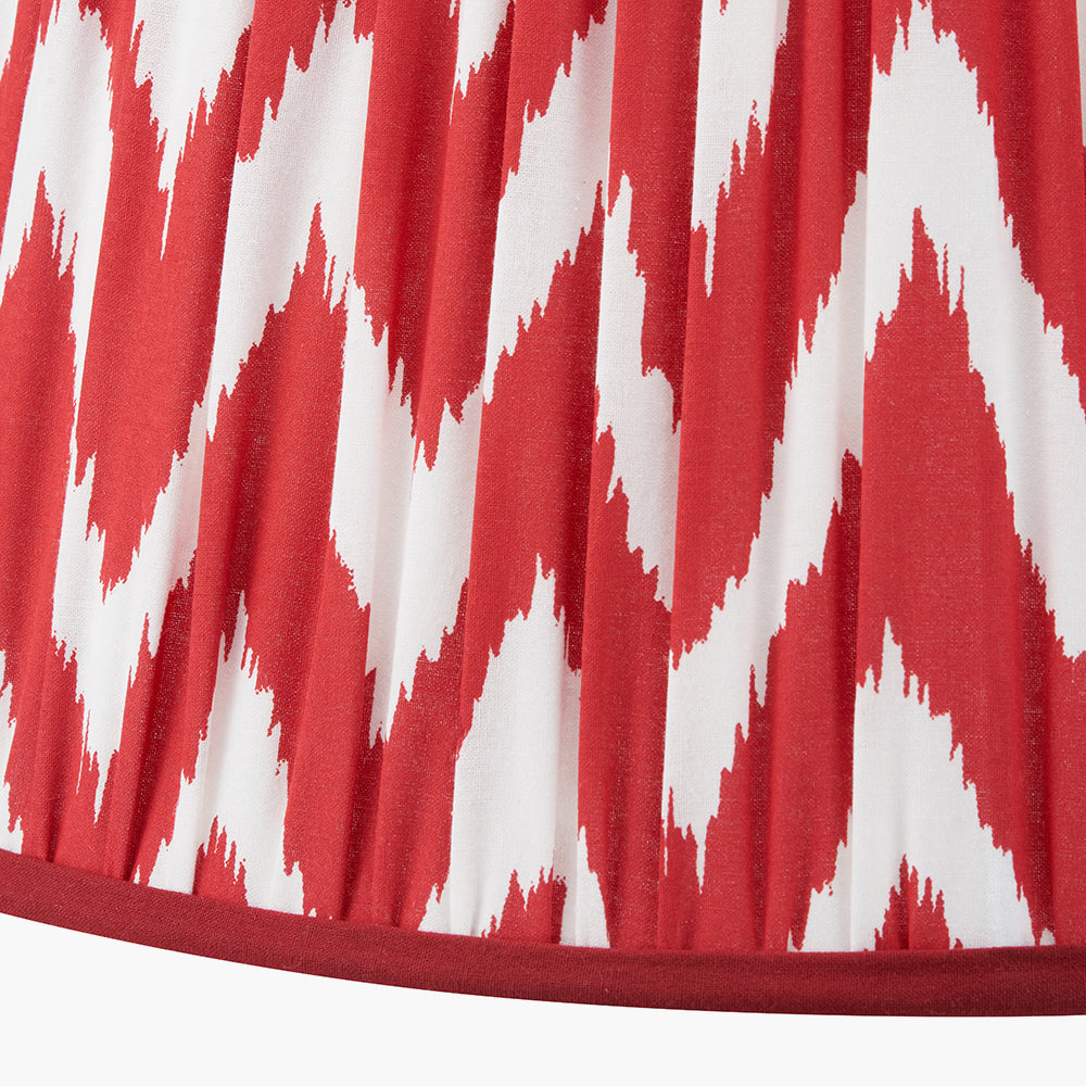 The Kamilah 40cm cotton mushroom pleat, tapered lampshade showcases a vibrant red and white chevron pattern, with a deeper red binding, adding a fresh and contemporary touch to any room. This eye catching design pairs effortlessly with a variety of lamp bases. This lampshade features a reversible gimbal, allowing it to be used with either a table or floor lamp base, or reversed for use as a ceiling pendant.
