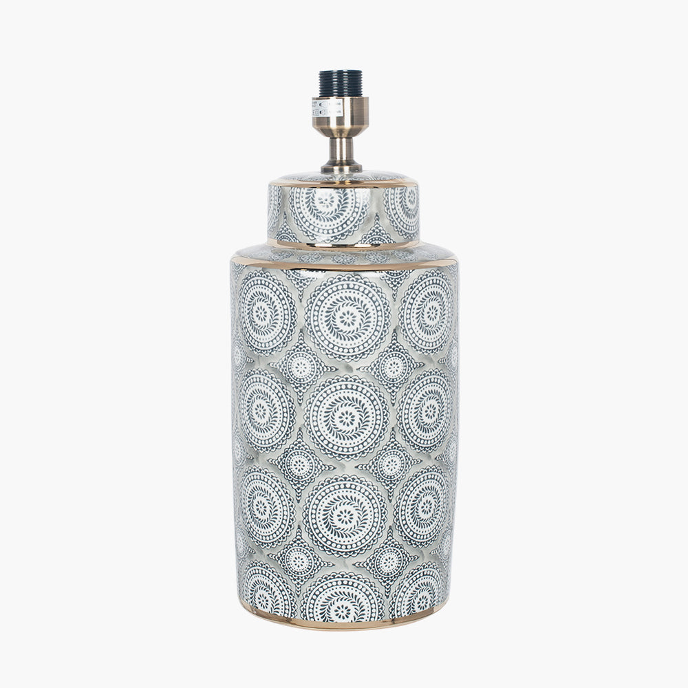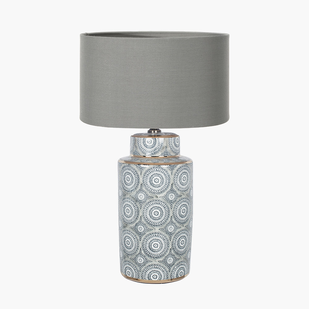Kari Circle Pattern Ceramic Table Lamp Base with Harry 40cm Steel Grey Cotton Mix Cylinder Lampshade
