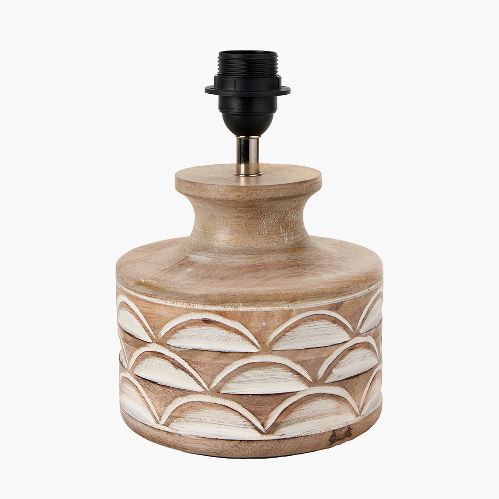 Elevate your living space with the Kingsbury White Wash Carved Wood Table Lamp Base with Harry 30cm Ivory Cotton Mix Cylinder Lampshade. Handcrafted with precision from high-quality mango wood in India, this exquisite lamp combines craftsmanship and timeless design to create a stunning centerpiece for any room.