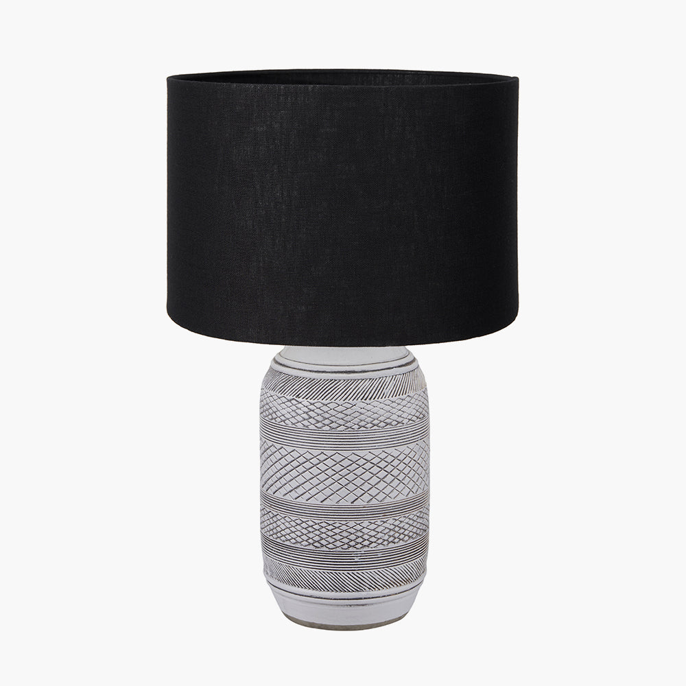 Kira White and Black Textured Stoneware Table Lamp Base with Lino 35cm Black Self Lined Linen Cylinder Lampshade