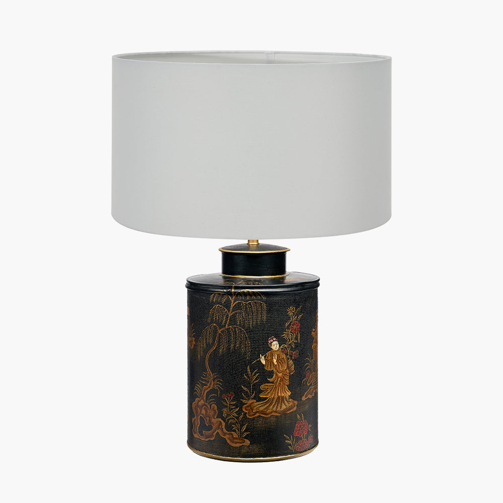 This beautiful lacquered iron lamp base in antique black with a stunning landscape theme is a true work of art. The design features an incredibly intricate illustration, all of which is painted free-hand by artists in India, and finished in a rich colour palette, creating a fascinating, awe-inspiring piece. The metal table lamp base has been teamed with a modern cotton mix cylinder lamp shade in an ivory hue to complete the look.