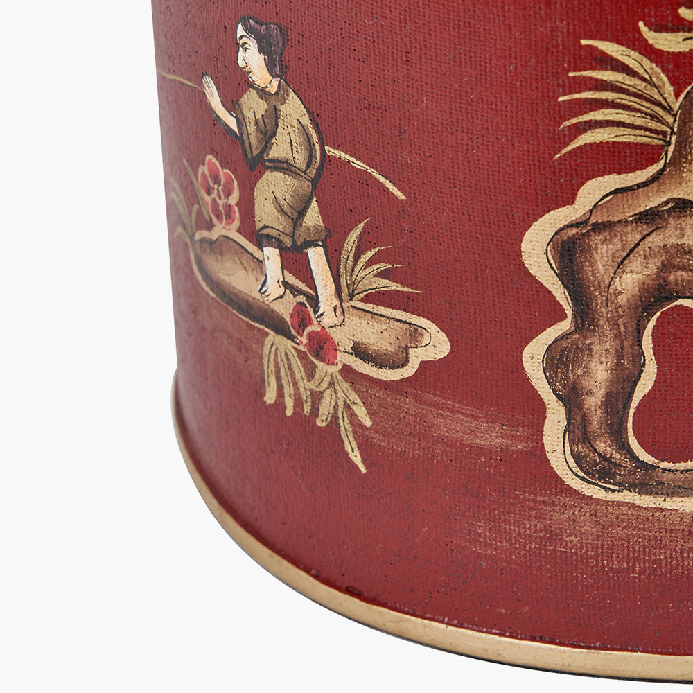 This beautiful lacquered iron lamp base in mulberry red with a stunning landscape theme is a true work of art. The design features an incredibly intricate illustration of a lady, all of which is painted free-hand in a rich colour palette, creating a fascinating, awe-inspiring piece. Styled with a black velvet cylinder shade with metallic bronze card inner, a luxurious choice sure to make a statement.