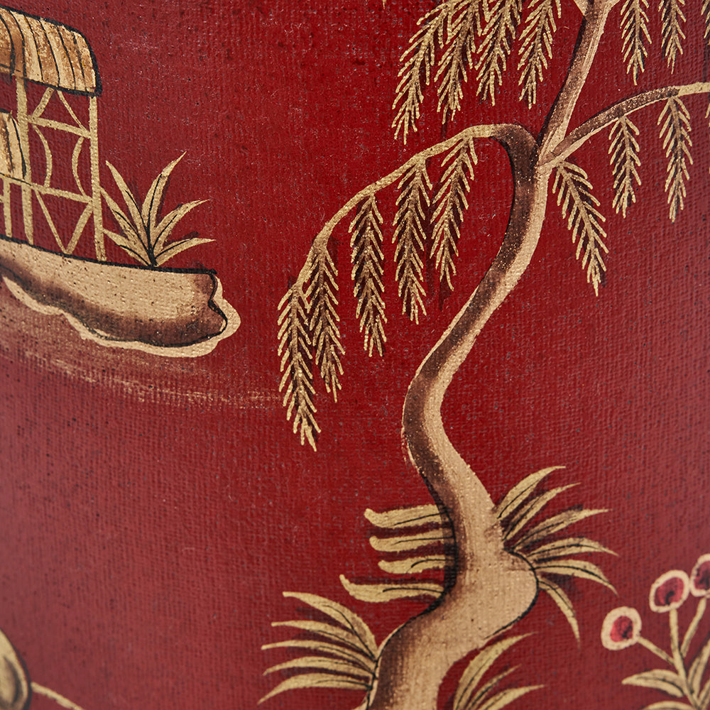 This beautiful lacquered iron lamp base in mulberry red with a stunning landscape theme is a true work of art. The design features an incredibly intricate illustration of a lady, all of which is painted free-hand in a rich colour palette, creating a fascinating, awe-inspiring piece. Styled with an open weave mulberry cotton cylinder shade, providing a luxurious opulent finish.