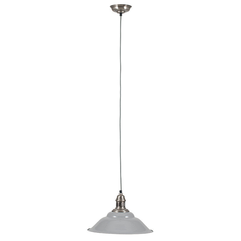 Stylish grey pendant finished with an antique silver lamp-holder. Ideal for kitchens, these cafe style pendants look great as a single or hung in multiples. Available in Black and Cream also.
