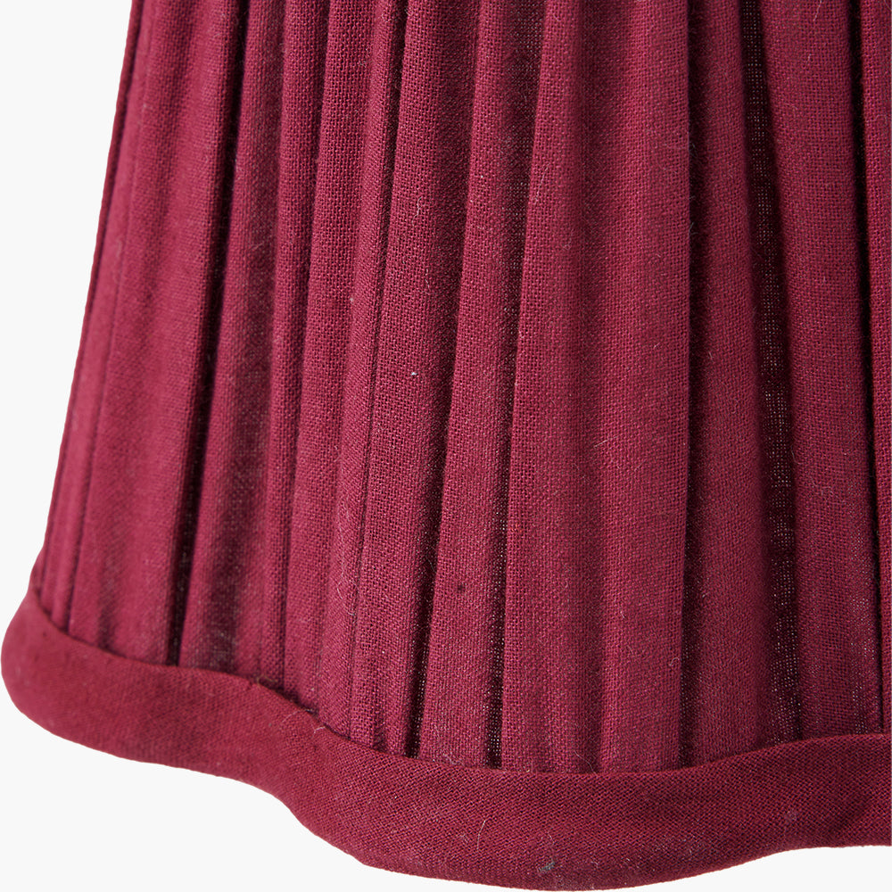 The Malia 18cm lampshade is a beautifully crafted mushroom pleat, scalloped lampshade, in a rich red hue with self colour binding. Its elegant silhouette and detailed pleating are enhanced by the soft curves of the scalloped edge, creating a bold yet timeless look. Designed to stand out, this striking shade adds warmth and character to any lamp base, making it a perfect statement piece for both classic or contemporary interiors.