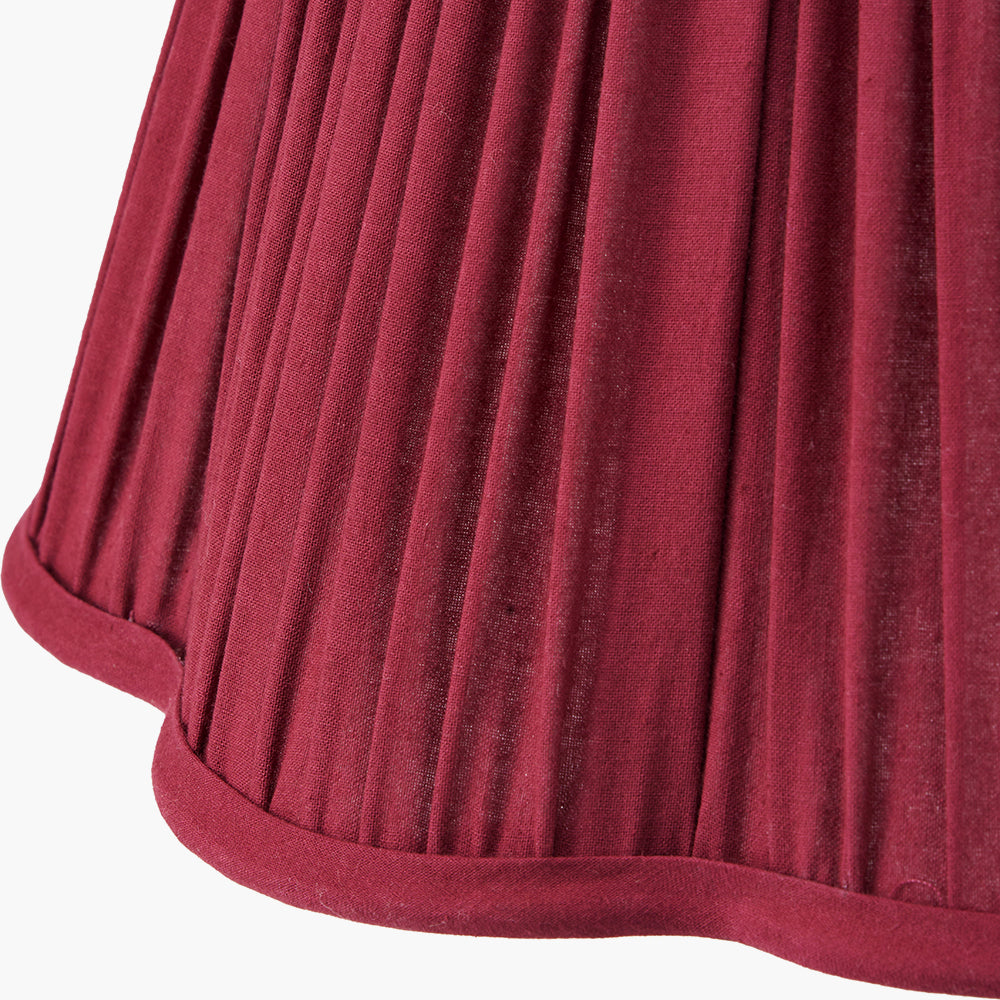 The Malia 35cm lampshade is a beautifully crafted mushroom pleat, scalloped lampshade, in a rich red hue with self colour binding. Its elegant silhouette and detailed pleating are enhanced by the soft curves of the scalloped edge, creating a bold yet timeless look. Designed to stand out, this striking shade adds warmth and character to any lamp base, making it a perfect statement piece for both classic or contemporary interiors. This lampshade features a reversible gimbal, allowing it to be used with either a table or floor lamp base, or reversed for use as a ceiling pendant.