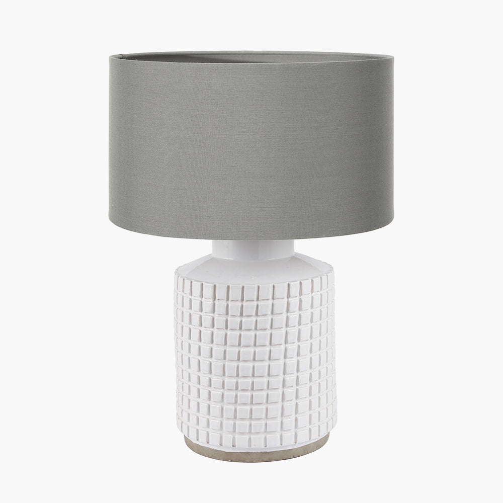 Malone Textured White Squares Design Stoneware Table Lamp Base with Harry 35cm Steel Grey Cotton Mix Cylinder Lampshade