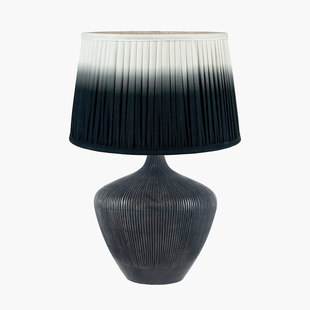 The Manaia Antique Black Textured Wood Table Lamp Base with Scallop 35cm Black Ombre Soft Pleated Tapered Shade blends contemporary design with timeless craftsmanship. A refined statement for any room, it pairs clean lines with tactile details to suit modern and classic decors alike.