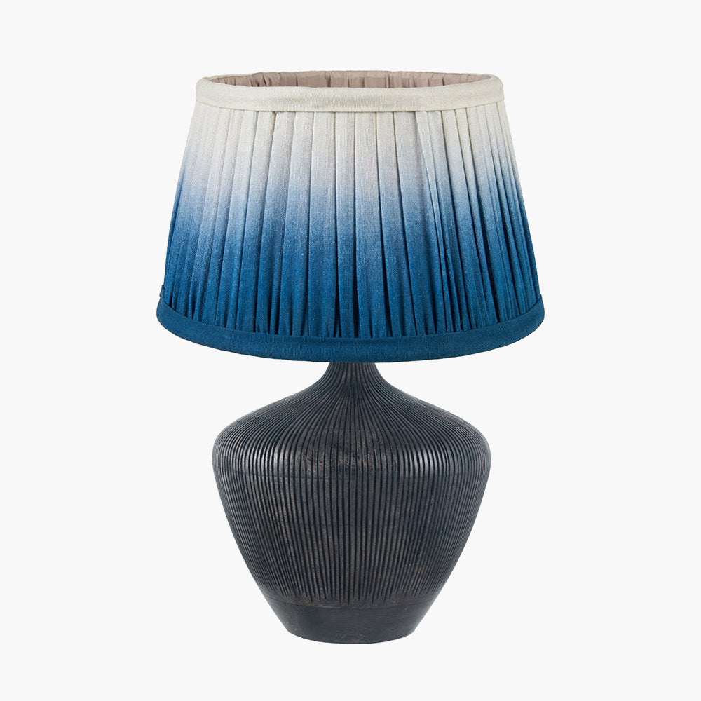 Discover the Manaia Antique Black Textured Wood Table Lamp Base with Scallop Blue Ombre Shade — a refined lighting piece that blends texture, silhouette, and color for a captivating glow.