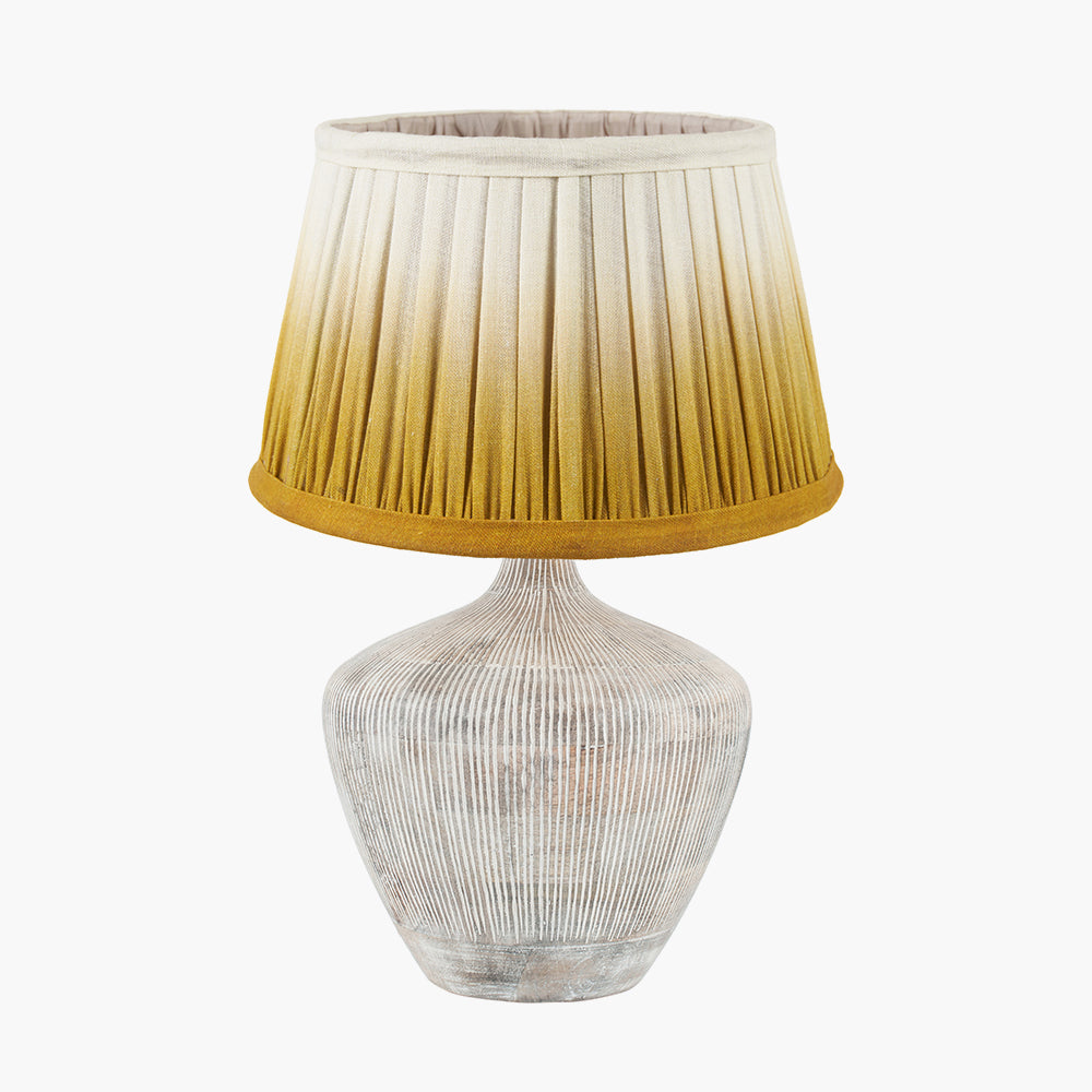 Introducing the Manaia White Wash Textured Wood Table Lamp Base with Mustard Ombre Soft Pleated Tapered Lampshade. This curved, elegant lamp blends contemporary design with natural wood texture, creating a versatile centerpiece for living rooms, bedrooms, or home offices.