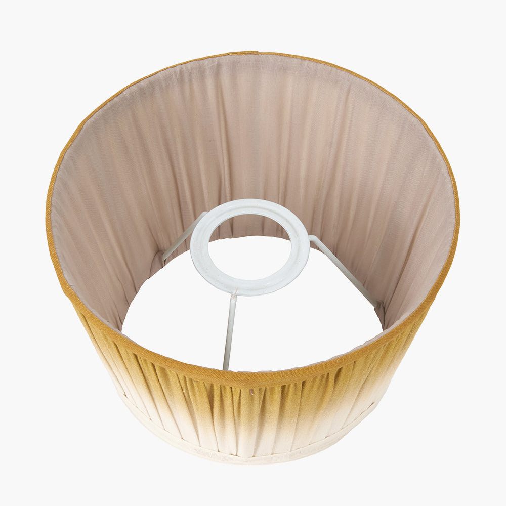 The lamp is completed with a hand mushroom-pleated, tapered shade in a warm mustard ombre, delivering a soft, inviting glow that suits relaxation or work spaces alike.