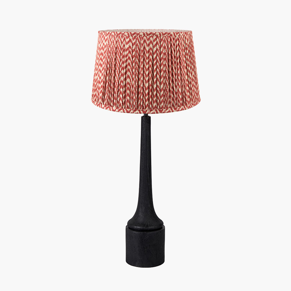 This tasteful black table lamp has the monochrome trend covered. Its the perfect addition to any room. Hand-finished in India, Its textured mango wood base and slender silhouette make for an elegant, stylish piece. Paired with a modern red and natural, hand mushroom pleated, tapered shade with an in-house curated ikat print to complete the look.