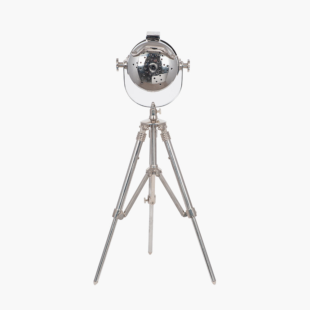 A Marine style searchlight table lamp that can be extended in height and the head moved around making it the perfect table lamp to light different areas of the room. Finished in shiny nickel and crafted in India. This lamp will be the focal point of any room. Also available as a floor lamp.