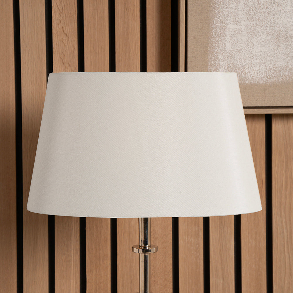 This elegant 45cm tapered oval shade in a classic cream colour silk mix is self lined which creates a warm glow when lit. This shade is the perfect size for a lamp on a console table or smaller space.