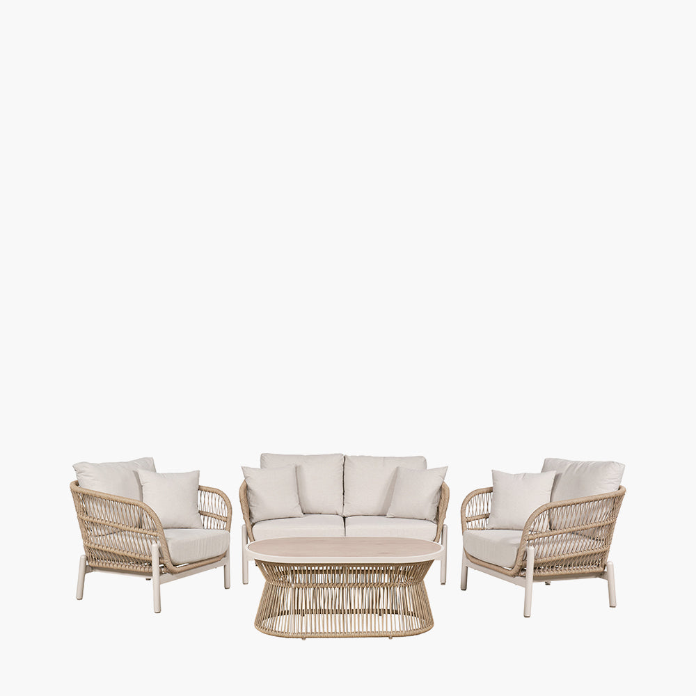 Enjoy quality craftsmanship with a powder-coated aluminium frame finished in a refined Latte hue, ensuring long-lasting resilience against the elements. The set features a 2-seater sofa, two armchairs, and a versatile coffee table, all accented with a Natural Synthetic Core Weave that adds a touch of organic charm to its modern design.