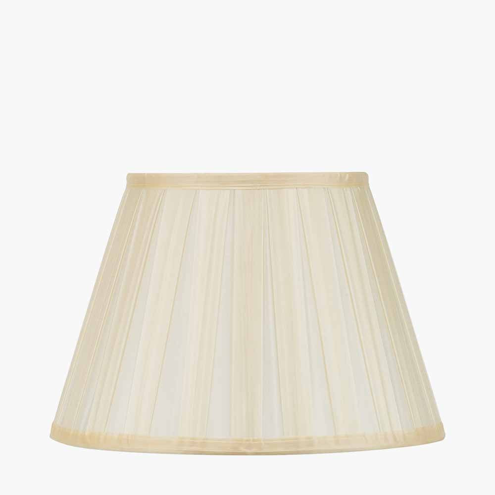 Made from a high-quality silk, our Maya 30cm lampshade is perfect to complement a classic look with its almond colouring. Its tapered shape features a wide box pleat detailing with a trim at the top and bottom, and it is lined in a soft colour to enhance a warm glow of light. Some larger shades within this range feature a reversible gimbal, suitable for table, floor, or ceiling use. Contact our Customer Support Team to confirm sizing and availability