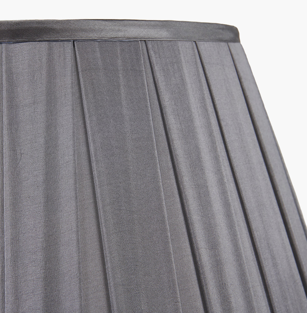 Made from a high-quality silk, our Maya 30cm lampshade is perfect to complement a classic look with its steel grey colouring. Its tapered shape features a wide box pleat detailing with a trim at the top and bottom, and it is lined in a soft colour to enhance a warm glow of light.