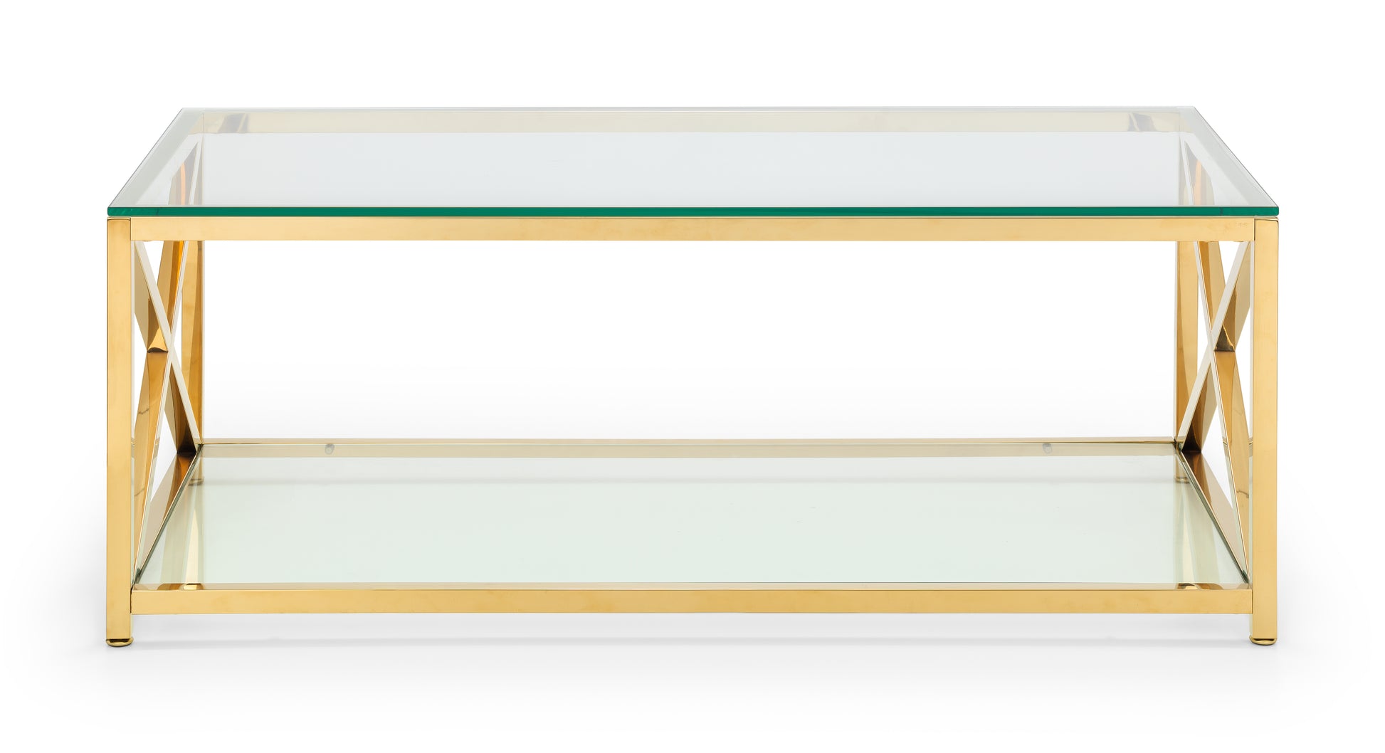 The Miami Coffee Table in Gold blends Art Deco elegance with modern durability, elevating any living space with a touch of class and luxury. Part of the lavish Miami occasional collection, this piece features a striking cross-frame silhouette crafted from a high-quality stainless steel frame and tempered glass. The gleaming gold finish and architectural lines make it a centerpiece while remaining versatile for everyday living.