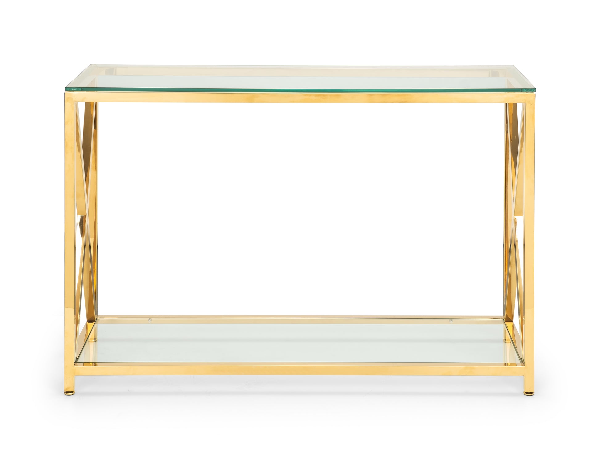 The lavish Miami occasional collection will add a touch of class and luxury to any home. Taking inspiration from the Art Deco period, the Miami features a striking cross frame design. Crafted from a high quality stainless steel frame and tempered glass, this console table provides a shelf underneath for additional storage.