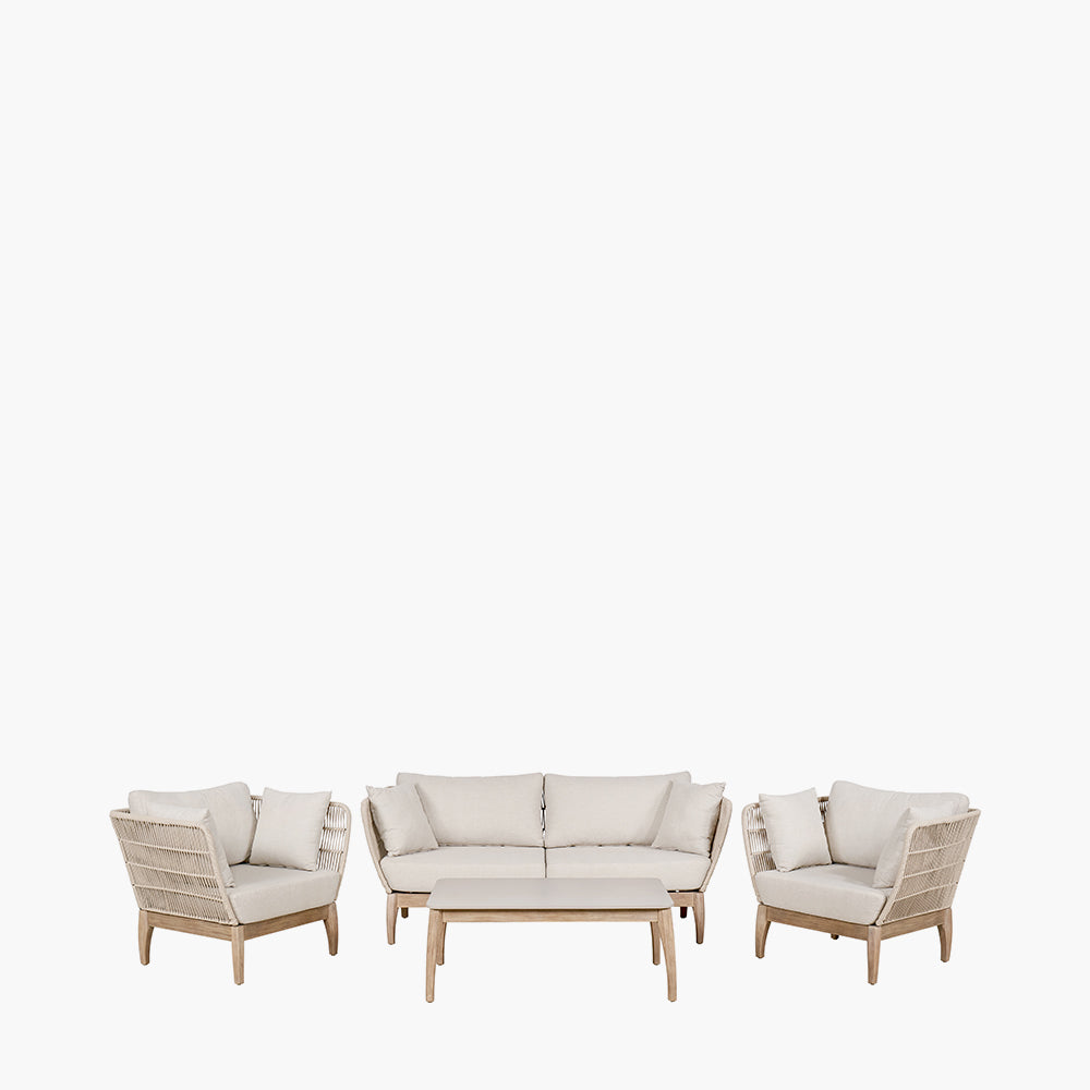 The set’s latte polyrope weave adds a touch of elegance, while the season-proof cushions, made from industry-leading Olefin fabric, resist fading, staining, and drying quickly—ideal for outdoor use. Light linen-colored cushions invite relaxation and comfort, whether you're lounging alone or entertaining guests.
