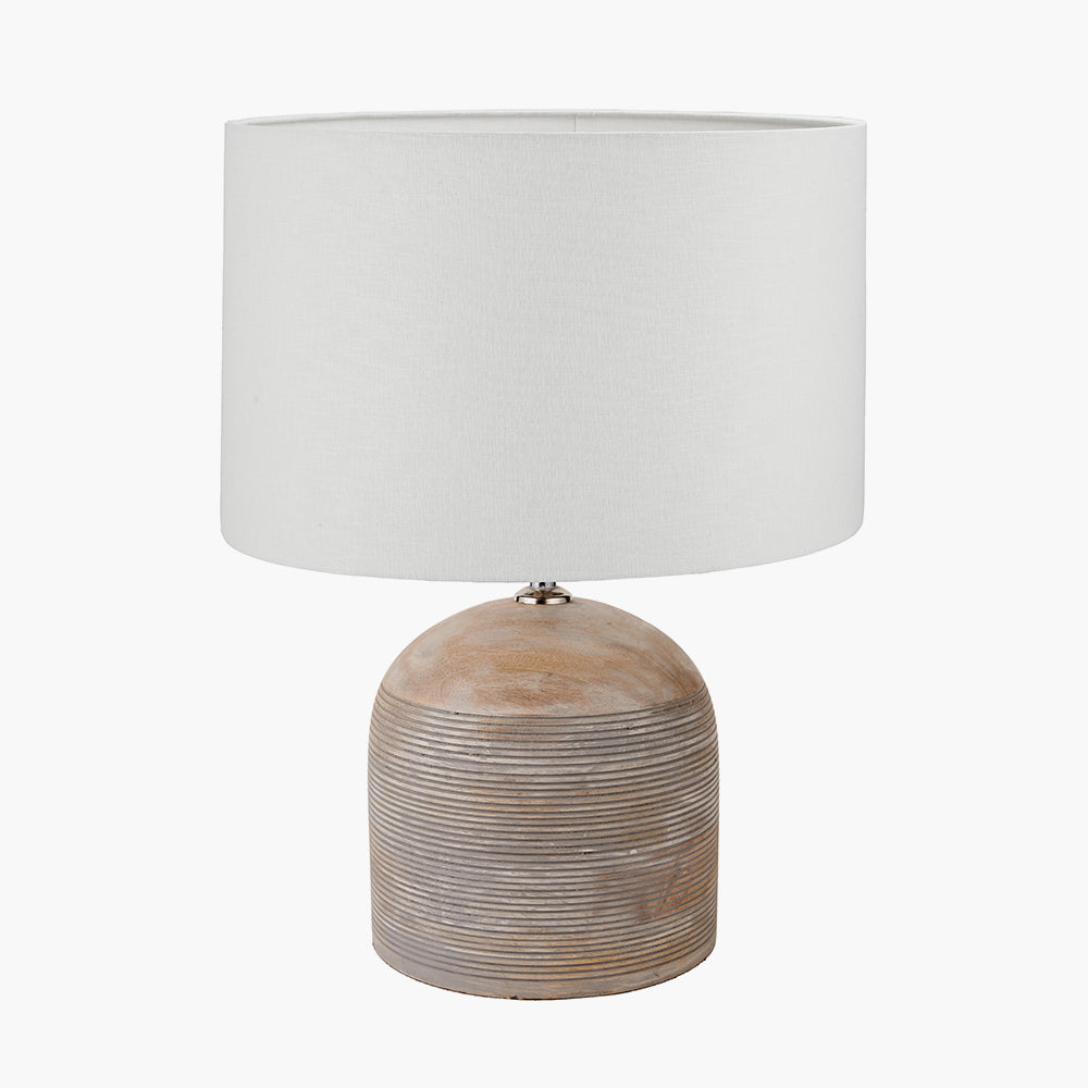 Nelu Grey Engraved Wood Dome Table Lamp Base with Lino 35cm White Self Lined Linen Cylinder Lampshade