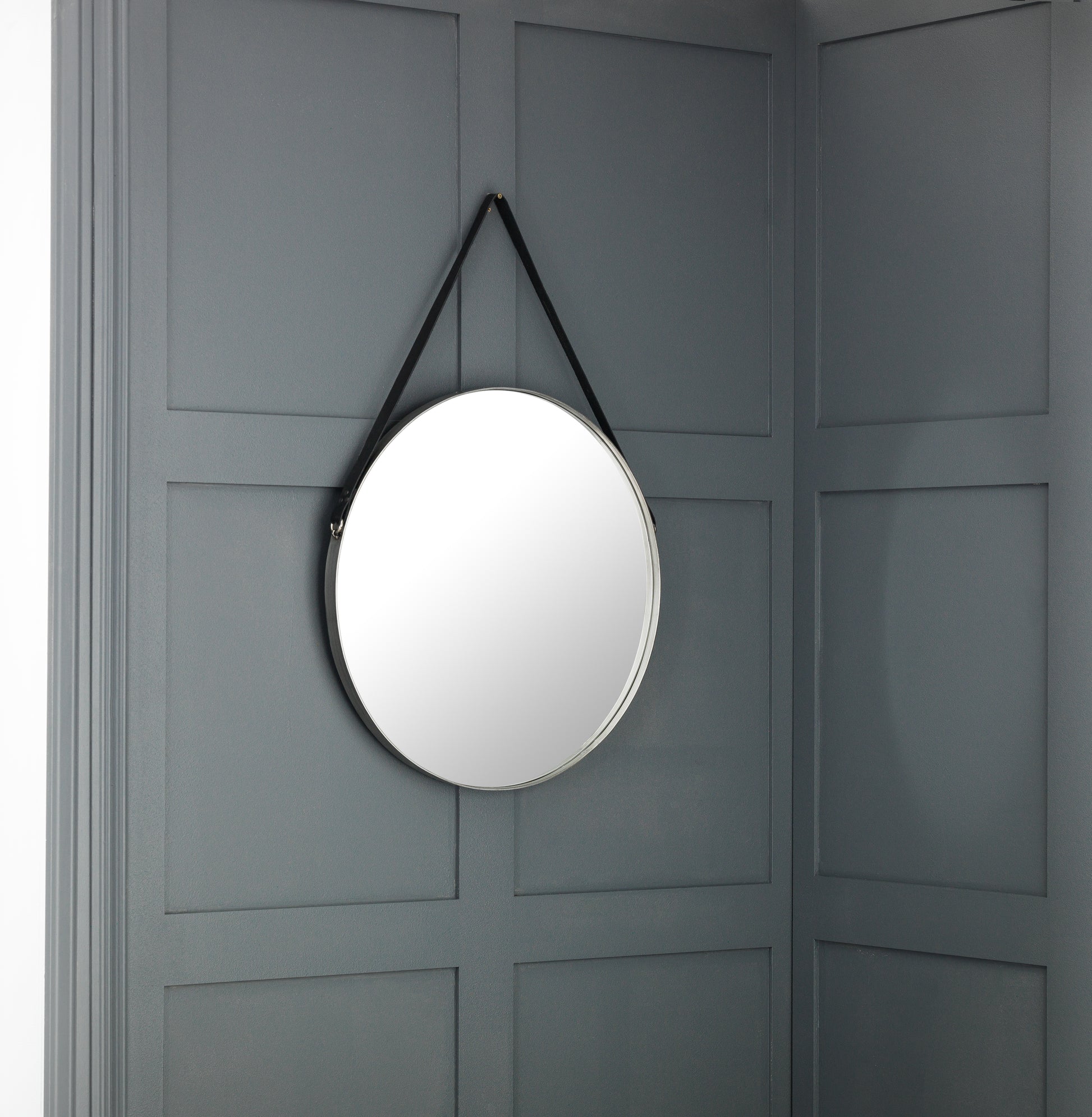 The Opera mirror is crafted from an antique silver metal frame, with an attractive round mirror and black leather strap. The simple, modern design allows the Opera mirror to be suitable for any living space. Please Note: The strap is for decorative purposes only and under no circumstances should be used to hang the mirror. Always use the hanging bracket on the back of the mirror.