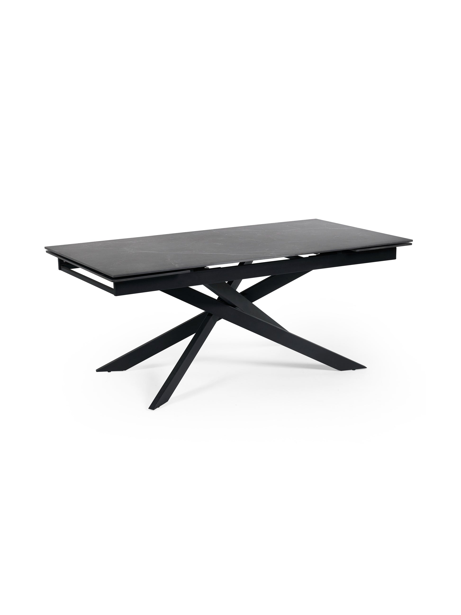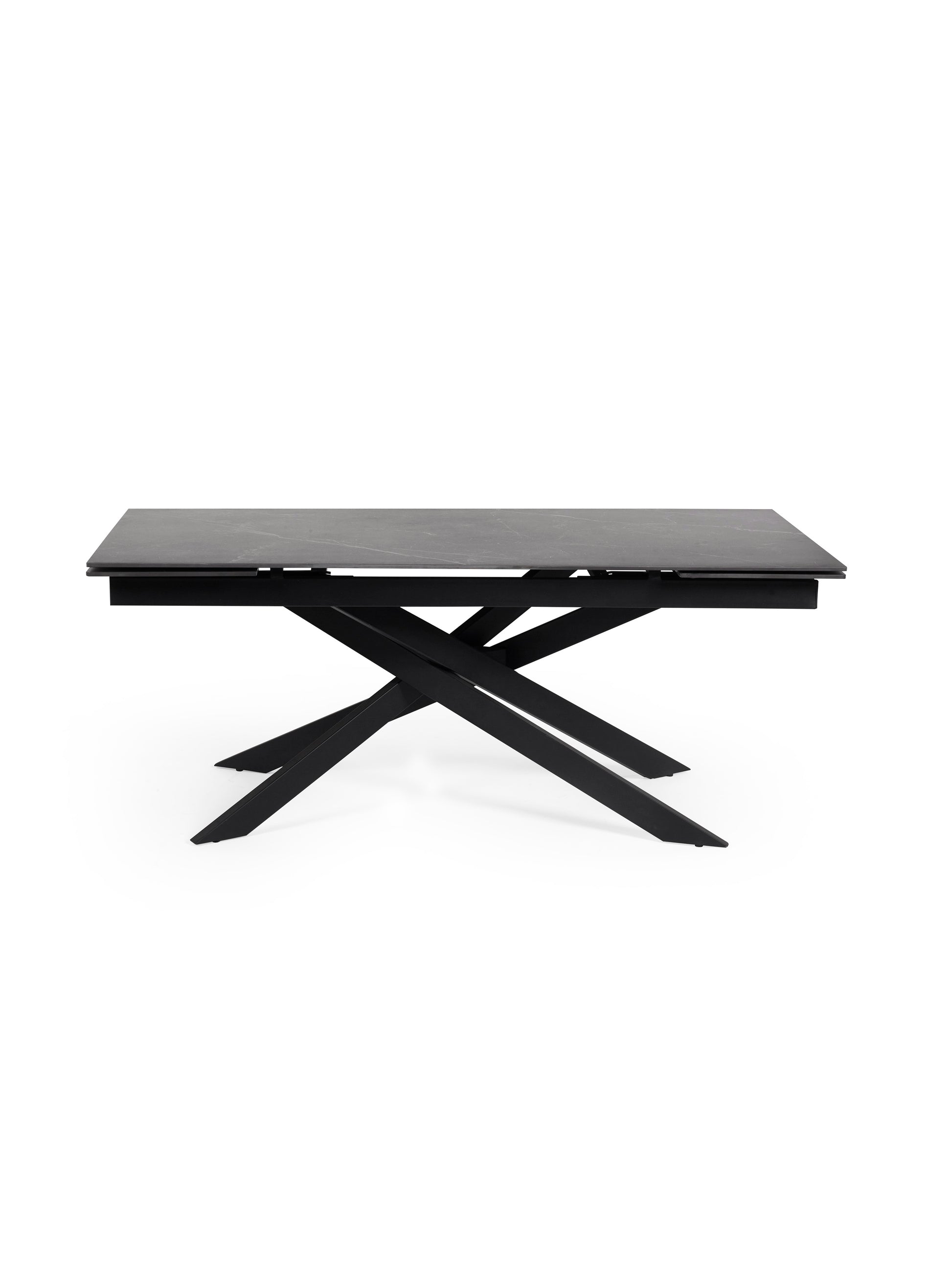 Designed to make a statement, the table’s asymmetrical black powder-coated metal legs create a bold and contemporary silhouette, while the solid metal base ensures exceptional stability. The extension leaf conveniently stores within the table when not in use, blending practicality with sleek design. Minimal assembly is required, ensuring a quick and seamless setup.