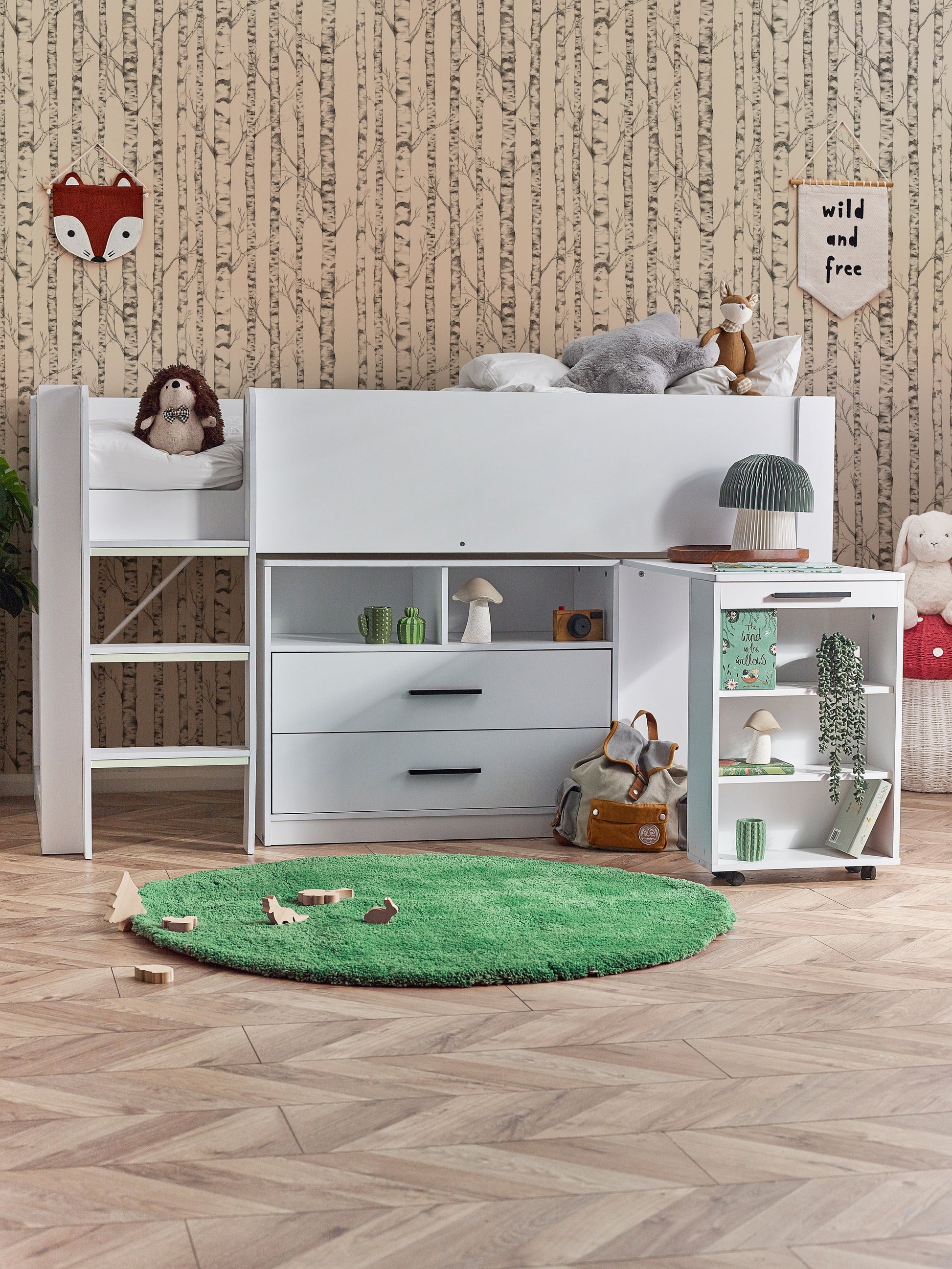 Otis Midsleeper – All White transforms bedtime into a delightful adventure with a clean, modern look that suits any child’s room. This versatile bed combines cozy sleeping space with smart, kid-friendly storage and study features, all in a pristine all-white finish.