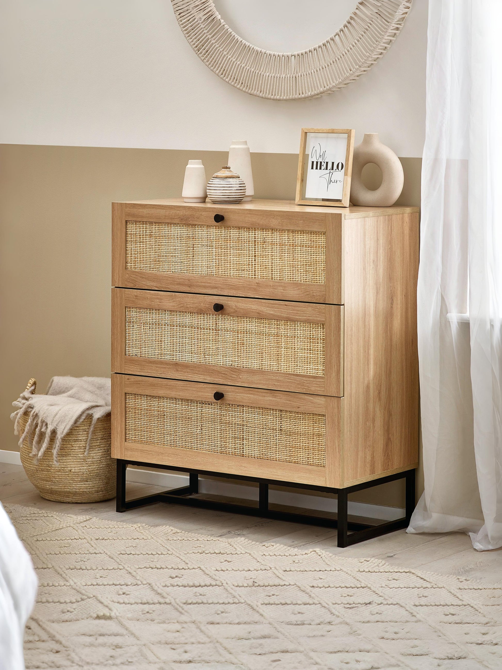 Fusing modern construction with retro design elements, the Padstow collection will exquisitely complement any styled home. The natural rattan fronts and industrial-style base collaborate perfectly to leave a warm yet chic aesthetic in your home. This range includes a bedside, 3 drawer chest, 6 drawer chest, wardrobe, coffee table, TV unit, sideboard, and tall bookcase. Also available in a black finish.