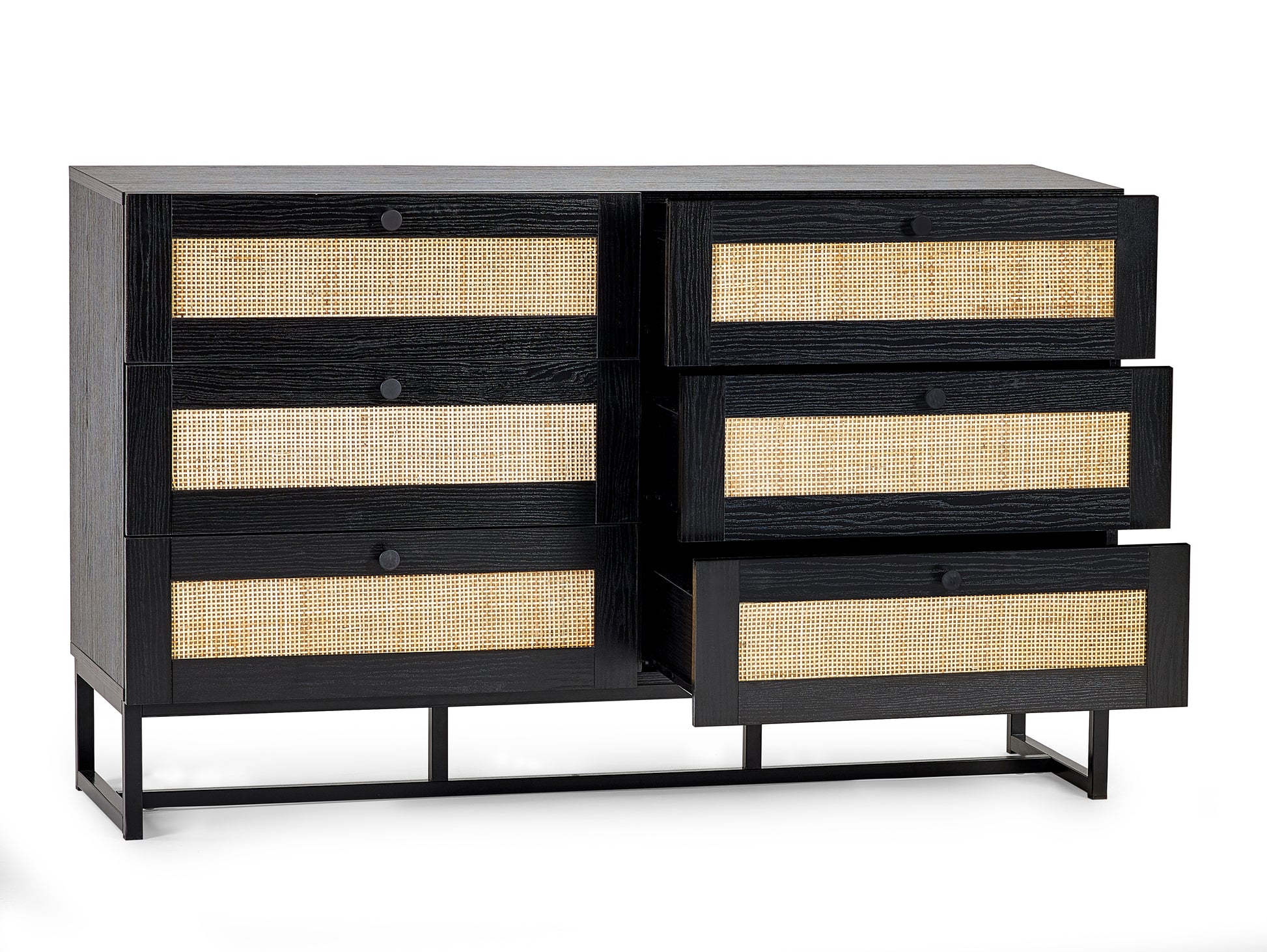 Fusing modern construction with retro design elements, the Padstow collection will exquisitely complement any styled home. The natural rattan fronts and industrial-style base collaborate perfectly to leave a warm yet chic aesthetic in your home. This range includes a bedside, 3 drawer chest, 6 drawer chest, wardrobe, coffee table, TV unit, sideboard, and tall bookcase. Also available in an oak finish.