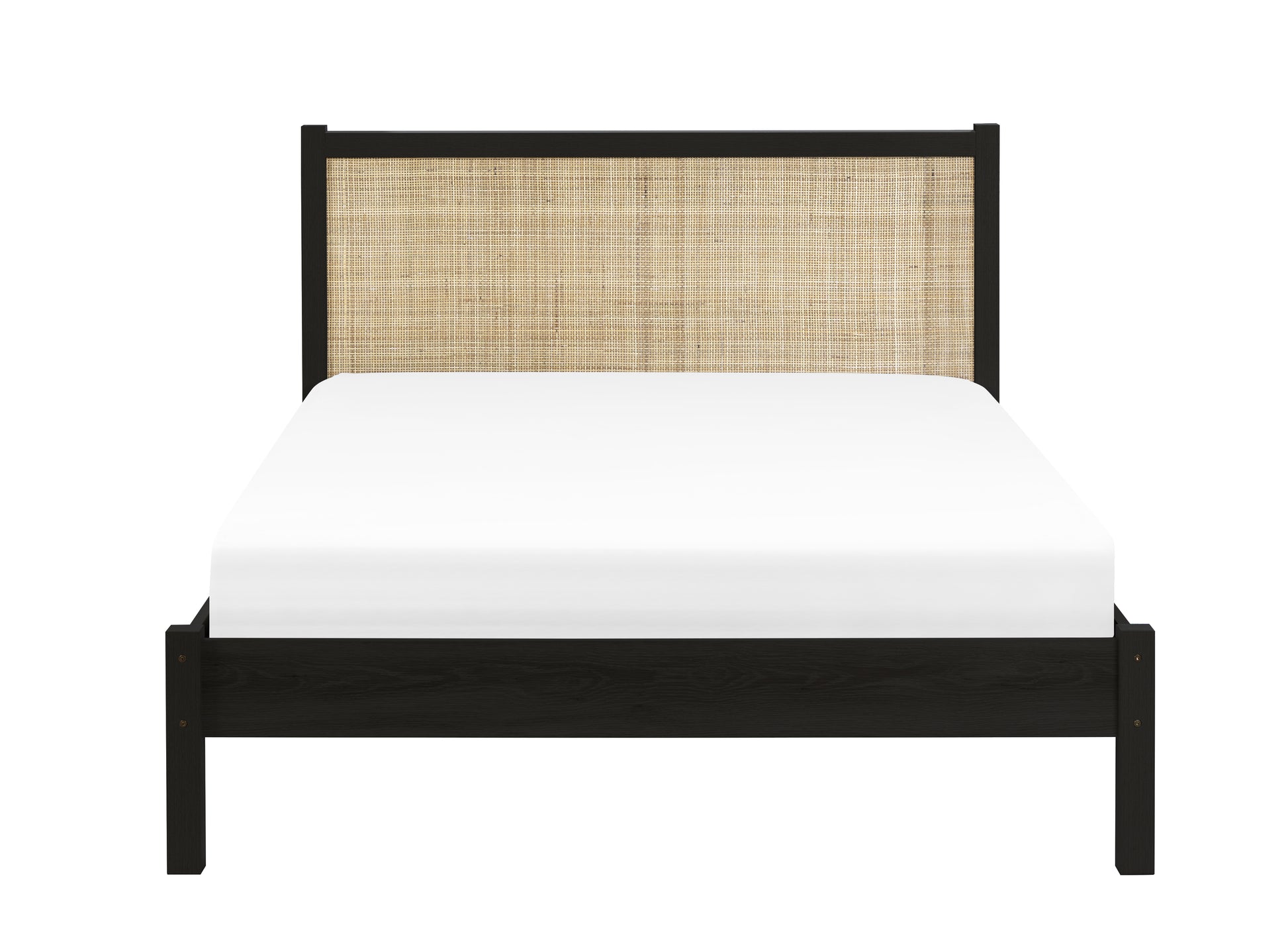 - Intricate woven rattan headboard offers tactile detail and timeless appeal.