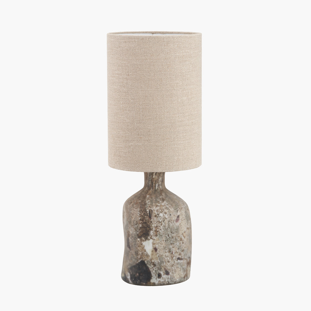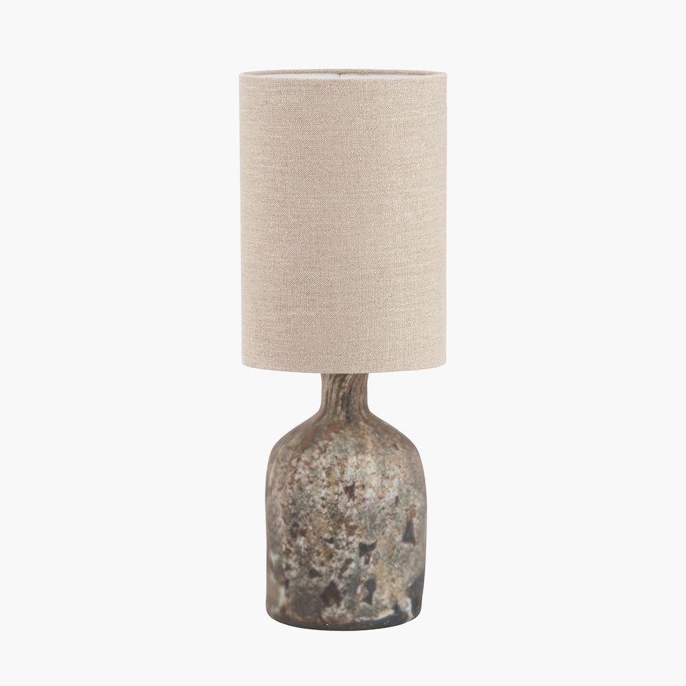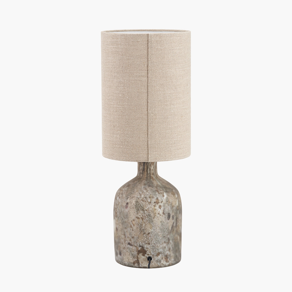 The Palmino Table Lamp, handcrafted in India features an elegant glass base with an organic silhouette. The bases are initially mouth blown and then the subtle colours and matt effect are created by fusing multiple layers of glass to create the beautiful sculptural form. The tall natural shade enhances the lamps fluid shape. A timeless piece that will add artistic flair to a side table or console.