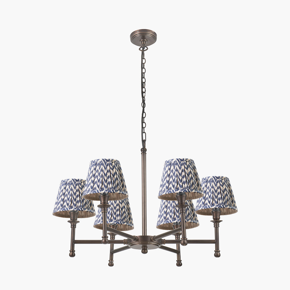 Elevate your home décor with our Piero Antique Bronze Metal 6-Arm Pendant. Handcrafted in India from cast brass components with an exquisite bronze finish, this stunning six-arm pendant features six blue chevron mushroom pleat lampshades. Its timeless design suits both contemporary and traditional interiors, bringing sophistication to any space.