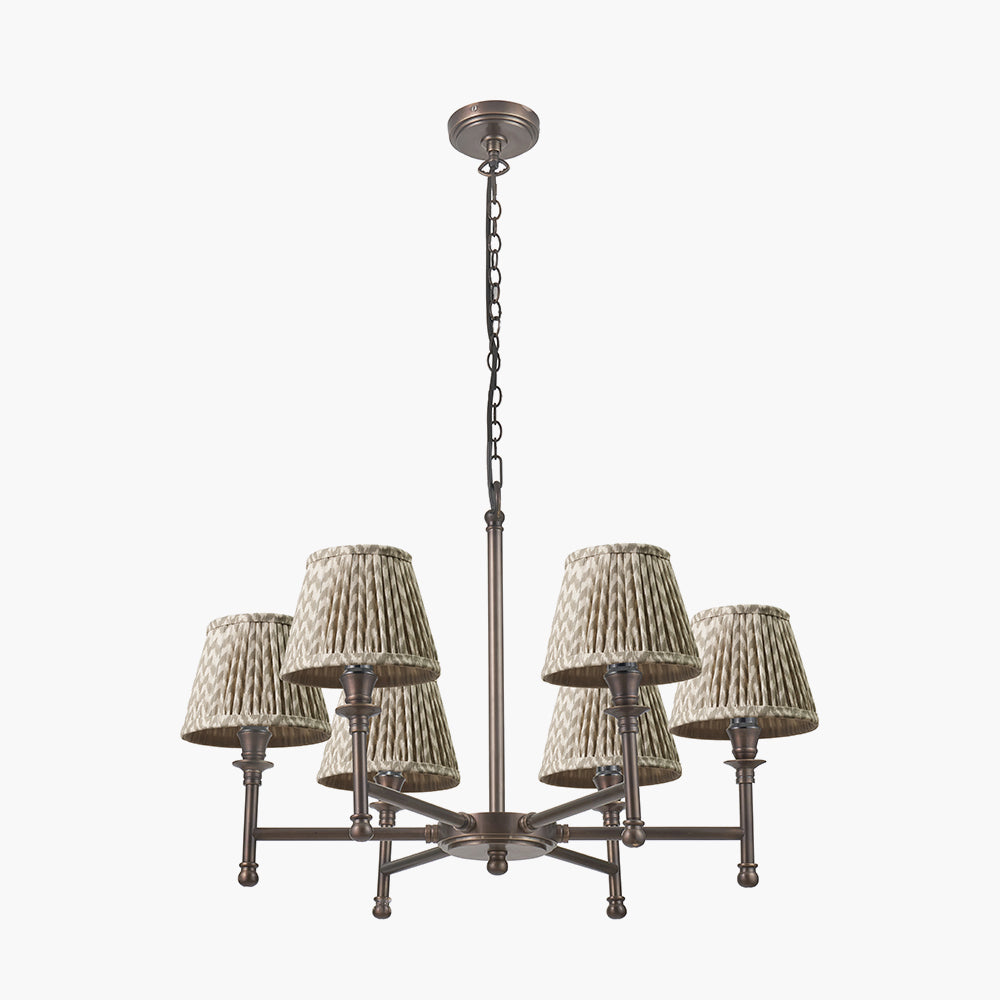Elevate your home décor with our Piero Antique Bronze Metal 6-Arm Pendant. Handcrafted in India from cast brass components with an exquisite bronze finish, this stunning six-arm pendant features six taupe chevron mushroom pleat lampshades. Its timeless design suits both contemporary and traditional interiors, bringing sophistication to any space.