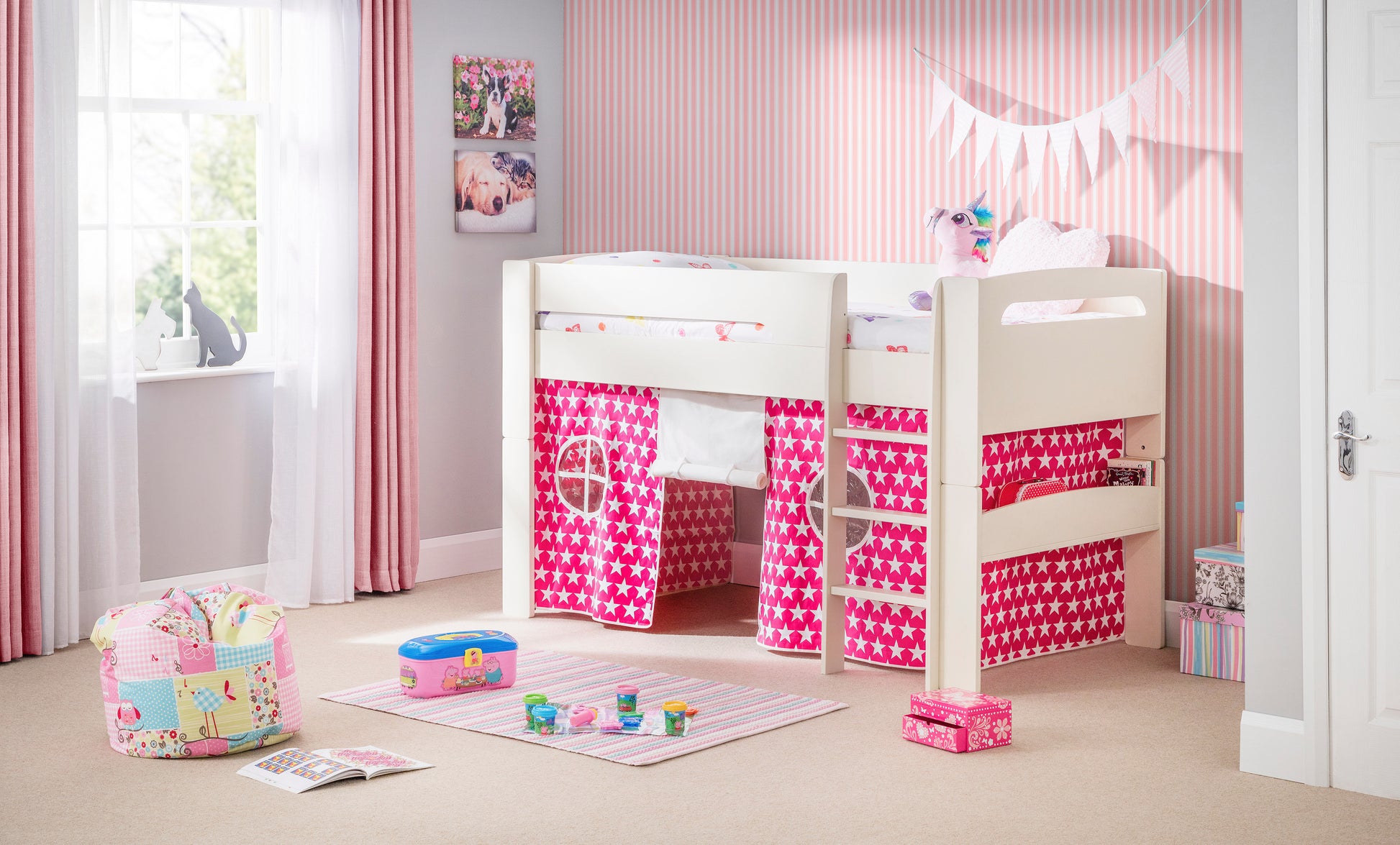 The Pluto Star Tent is available in either pink or blue and is a stylish accompaniment to the Pluto mid-sleeper, creating a fun and vibrant play space.