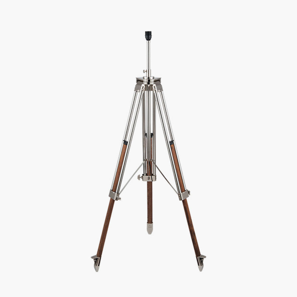 The oversized wooden tripod base provides a substantial presence, while chrome metal detailing on the legs adds a contemporary twist. With oak finish legs, this lamp base channels nautical glamour in a fresh, modern silhouette.
