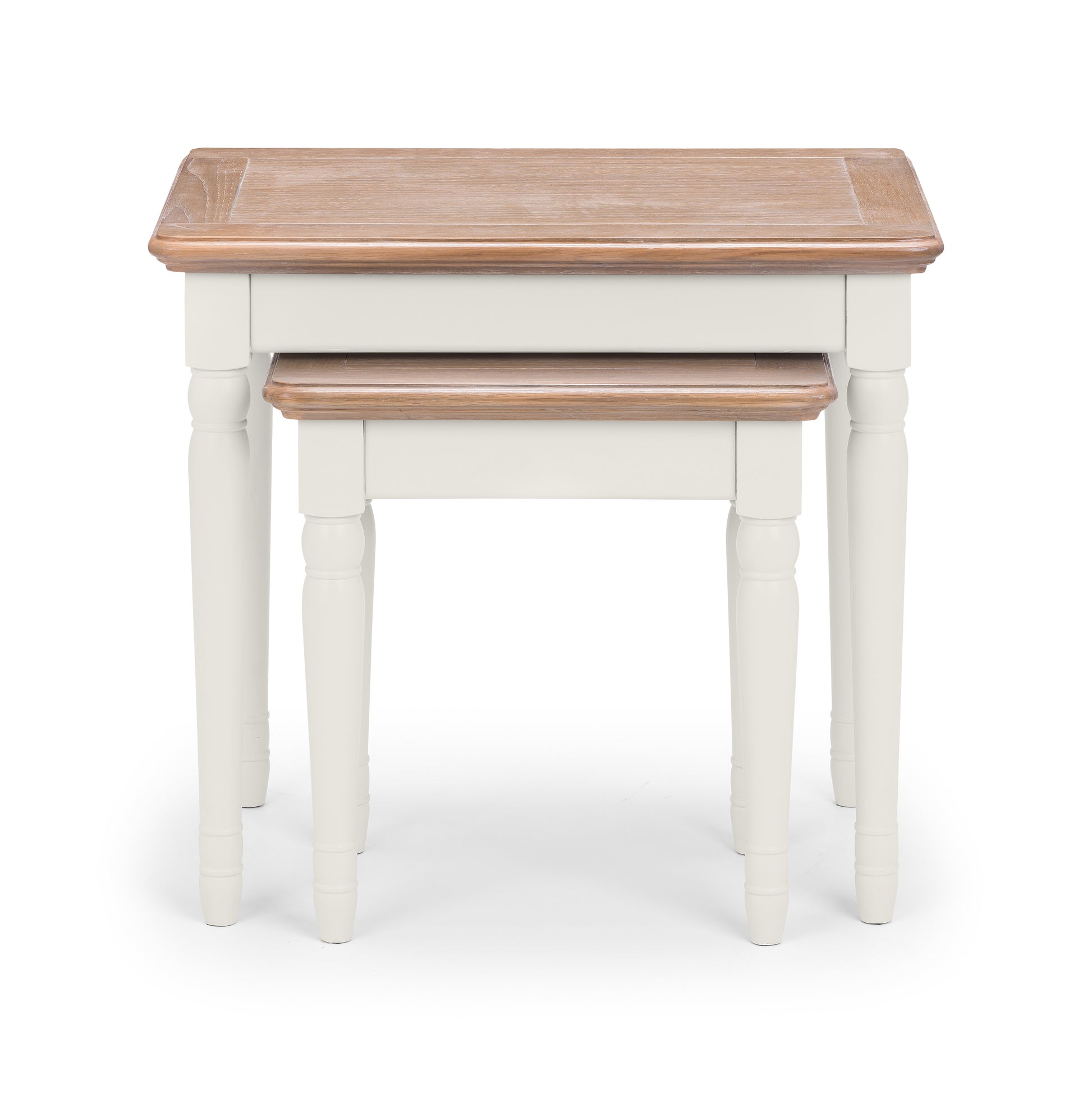 This timeless nest of tables offer an authentic antique design with a classic turned leg design perfect for contemporary spaces as well as traditional homes. Finished in a light grey lacquer with a limed oak effect top, the Provence features 2 tables that perfect fit away under one another when not in use. Part of the Provence dining and occasional collection.