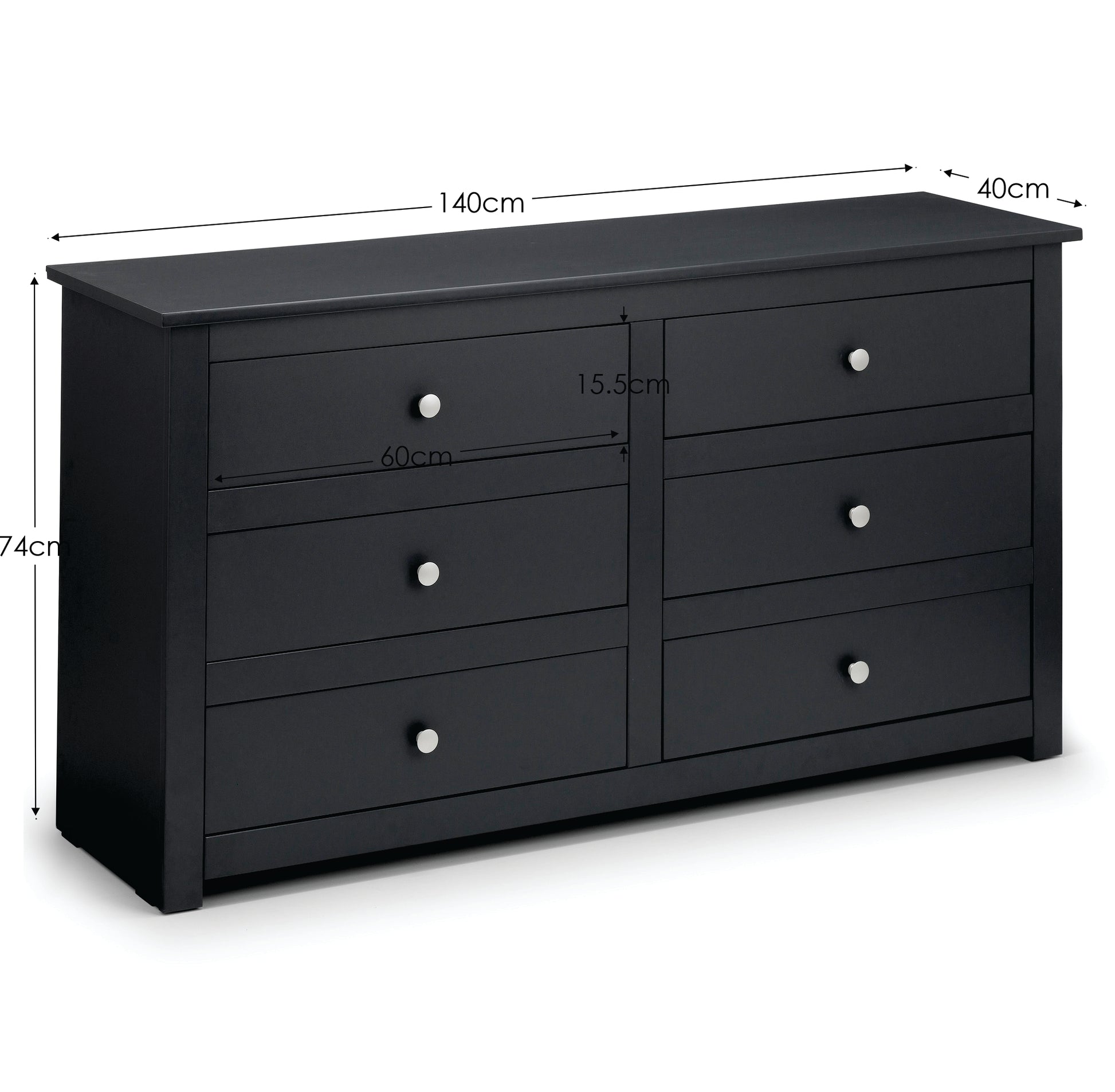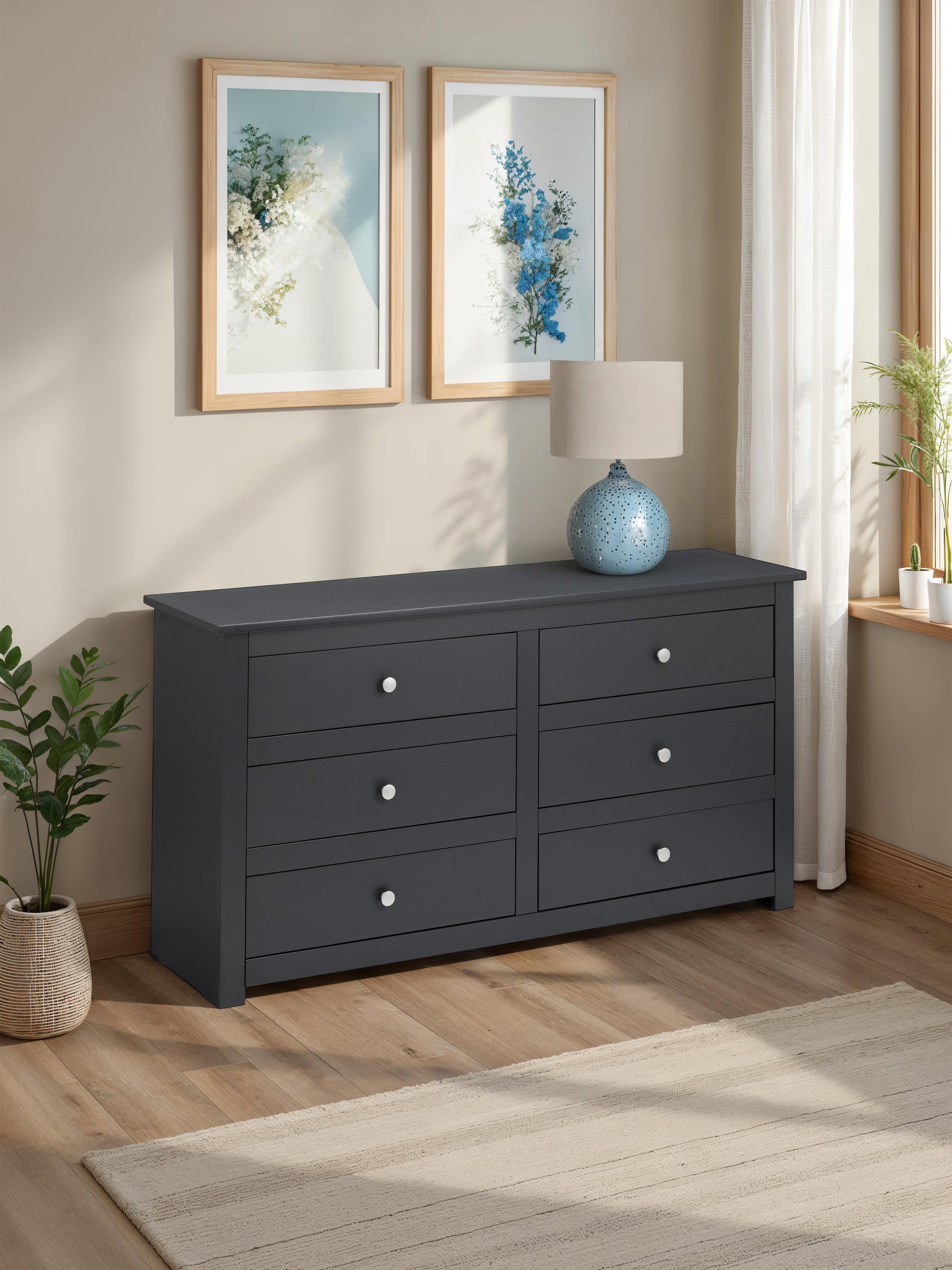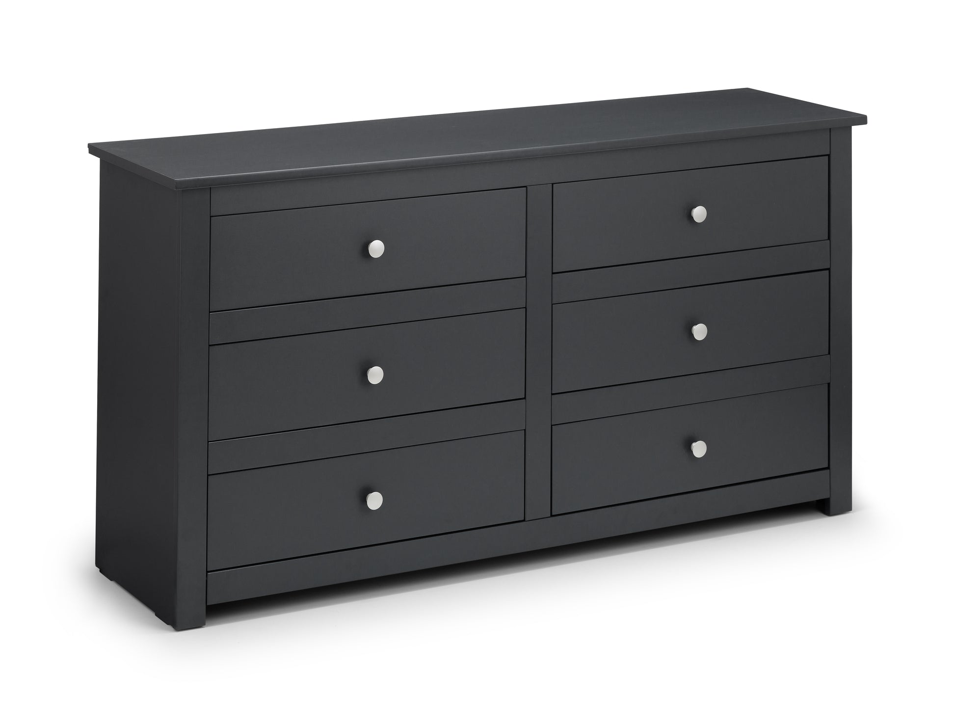Boasting clean, simple lines the Radley 6 drawer chest is perfectly suited for both modern or traditional styles. Featuring six generously sized drawers, to keep your bedroom neat and tidy. Finished in an anthracite lacquer, with delicate silver handles, the Radley Bedroom Collection is perfect for adult and kids bedrooms.