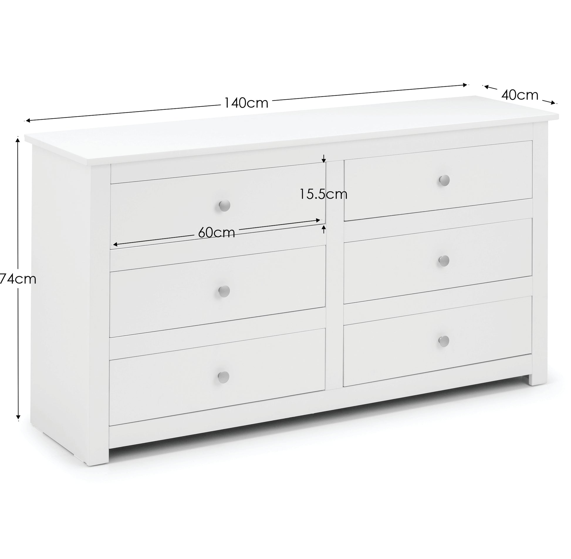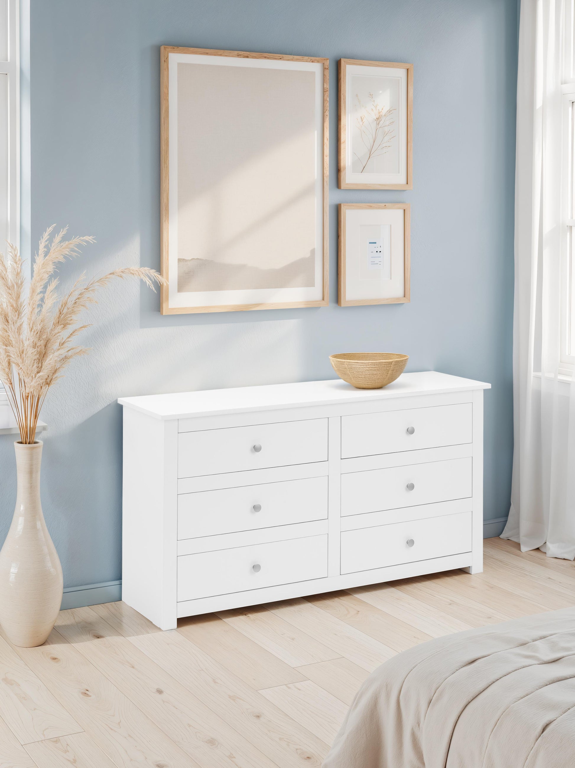 Boasting clean, simple lines the Radley 6 drawer chest is perfectly suited for both modern or traditional styles. Featuring six generously sized drawers, to keep your bedroom neat and tidy. Finished in a surf white lacquer, with delicate silver handles, the Radley Bedroom Collection is perfect for adult and kids bedrooms.