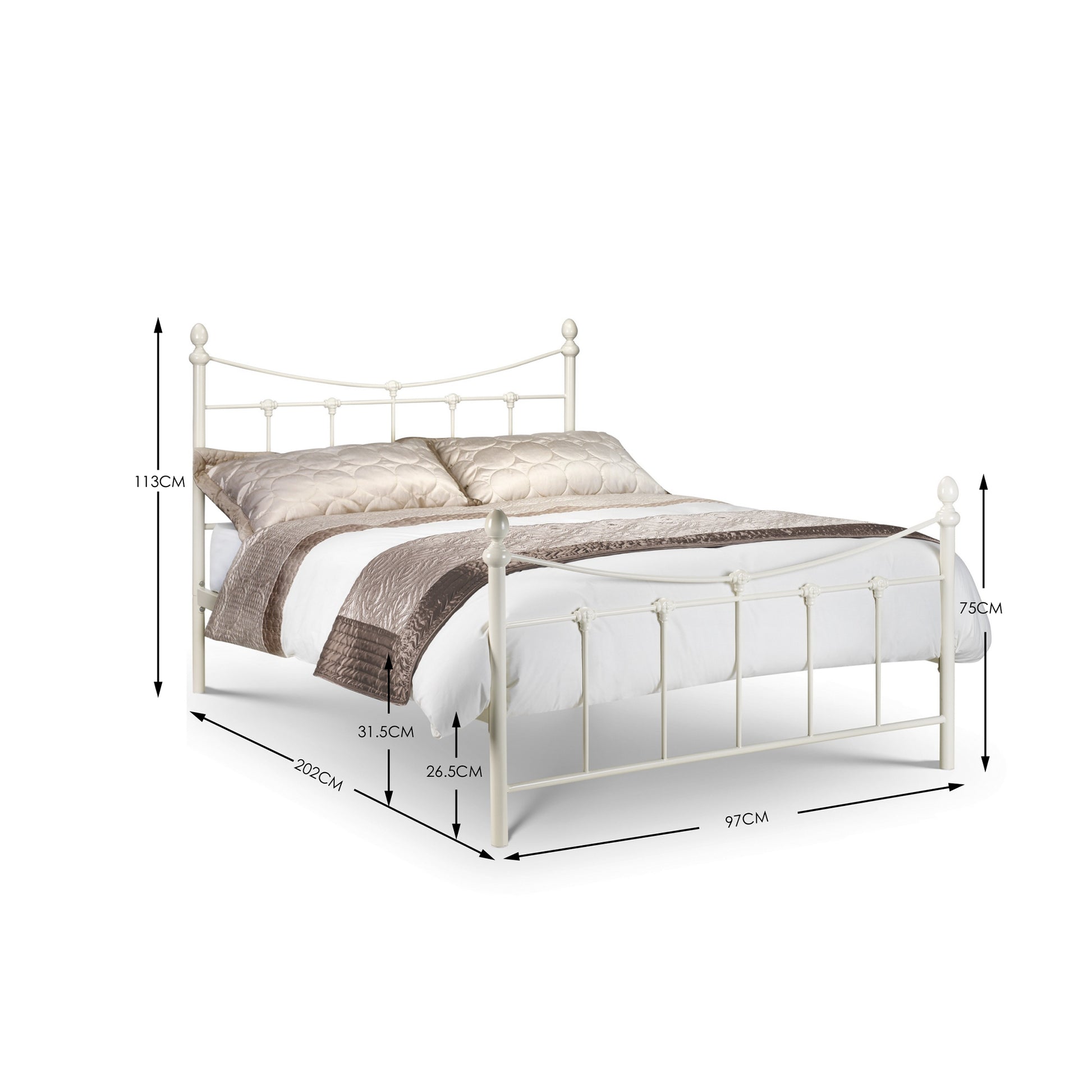 Rebecca 90cm Single Bed - Stone White is an elegant metal bed finished in a crisp stone white, designed to elevate any bedroom with timeless style. Built to the highest standard, its classic silhouette complements both contemporary and traditional décor, while a sturdy steel frame ensures durability and stability. A sprung slatted base adds comfort underfoot and helps prolong mattress life, so you can enjoy better sleep for longer. The Rebecca bed features a stone white finish that matches Julian Bowen's Cameo bedroom furniture range, making it easy to create a cohesive look across your room.