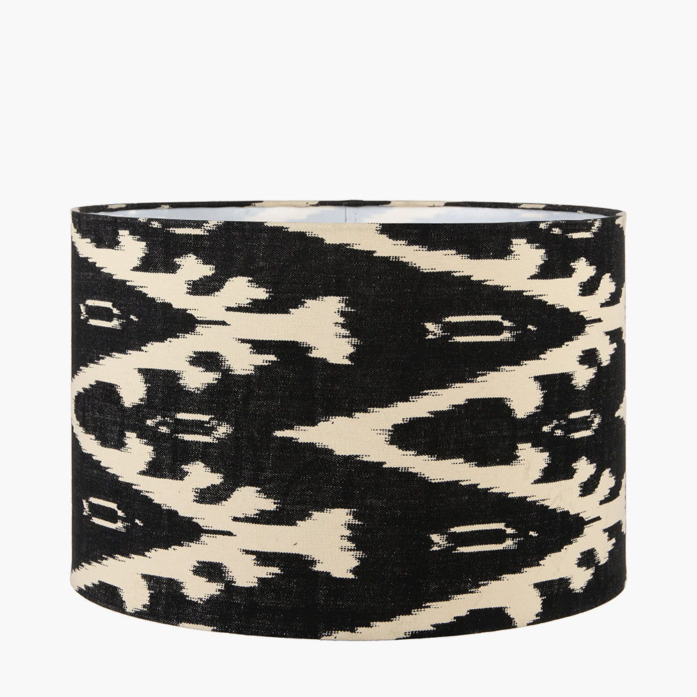 A simple yet elegant metal floor lamp base with a modern deep stepped foot finished here in a contemporary matt black. The floor lamp is paired with a fabulous cotton cylinder shade in striking black, with an on-trend Ikat design, injecting colour and pattern into your interior.