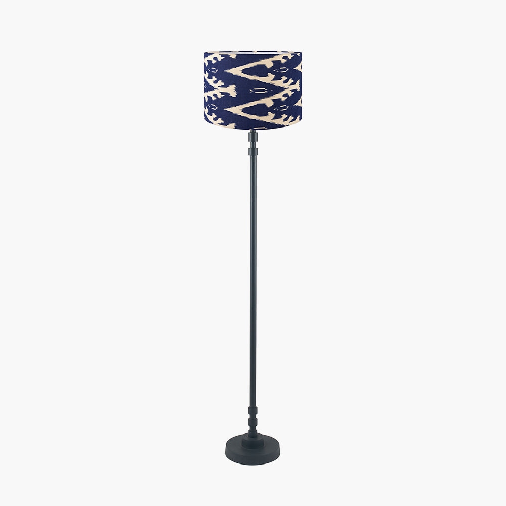 A simple yet elegant metal floor lamp base with a modern deep stepped foot finished here in a contemporary matt black. The floor lamp is paired with a fabulous cotton cylinder shade in striking blue, with an on-trend Ikat design, injecting colour and pattern into your interior.