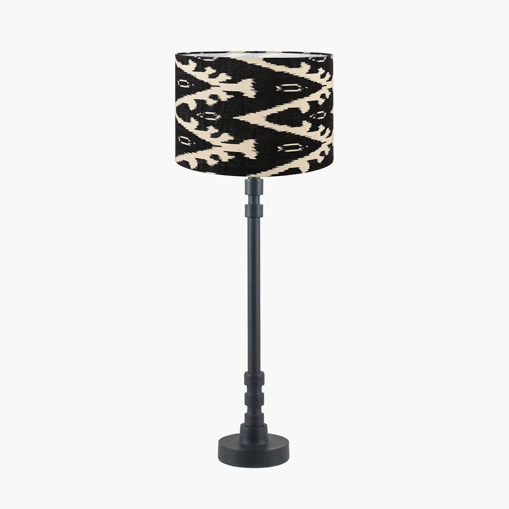 This simple yet elegant stick lamp base with a modern deep stepped foot is finished in contemporary matt black. The table lamp is paired with a fabulous cotton cylinder shade in striking black, with an on-trend Ikat design, injecting colour and pattern into your interior.