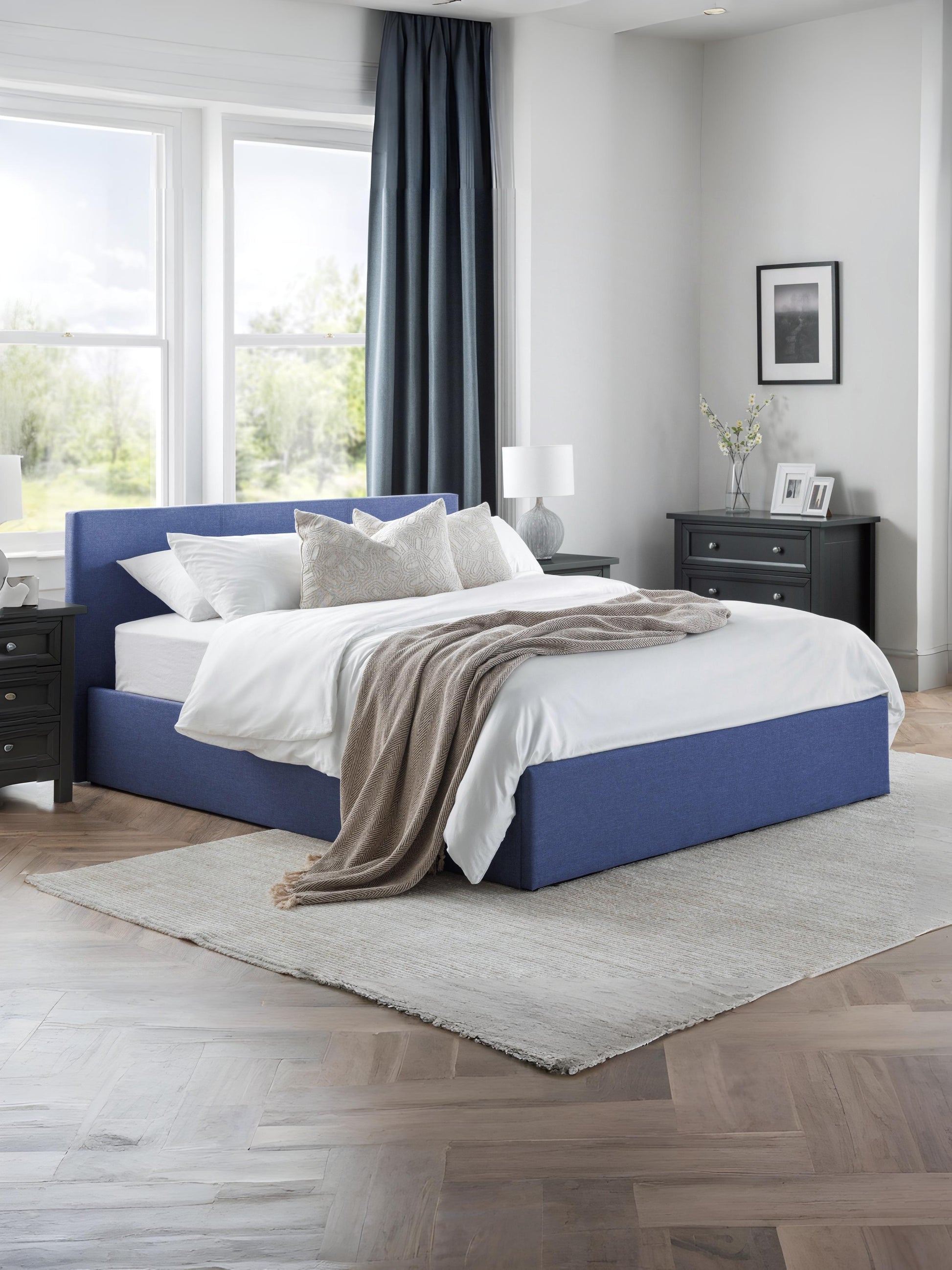 Rialto Ottoman Storage 135cm Double Bed in dark blue linen brings modern, clean lines and practical storage to your bedroom. This stylish bed combines contemporary charm with everyday function, making it the perfect centerpiece for a wide range of bedroom styles.